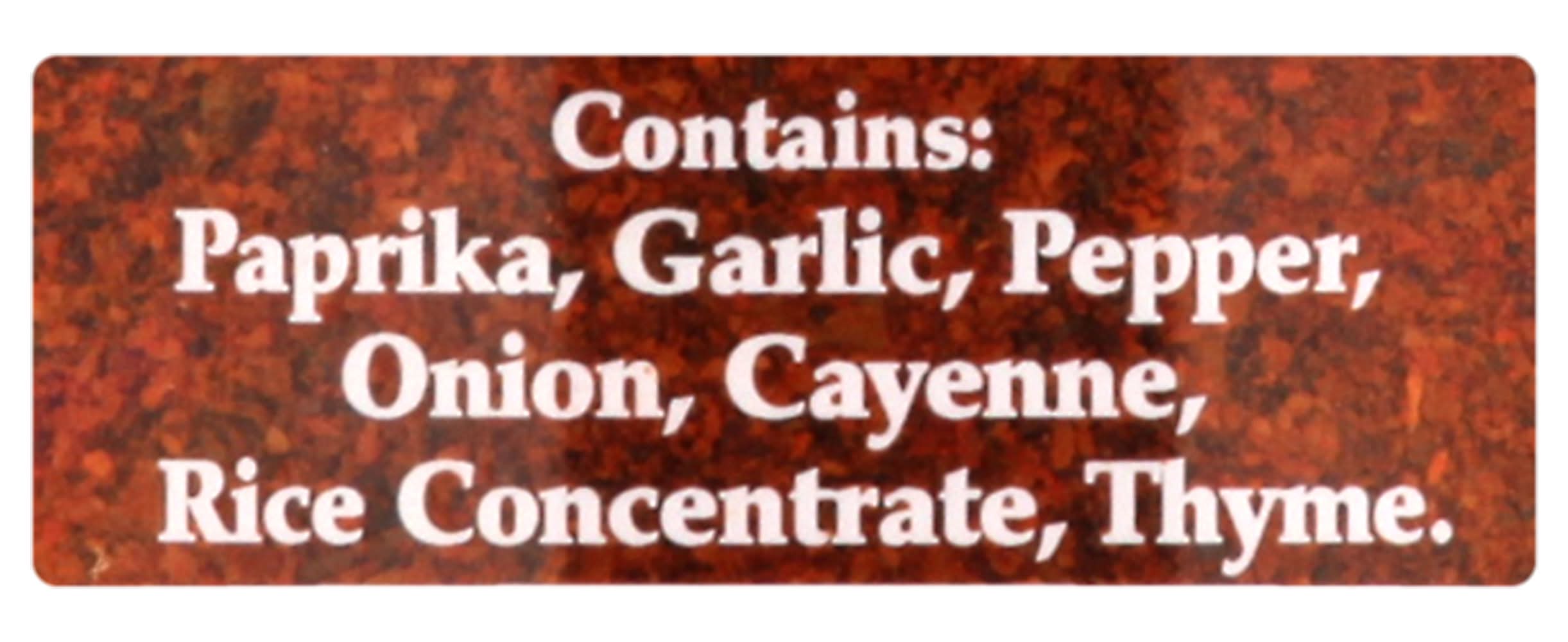 Contains: Paprika, Garlic, Pepper, Onion, Cayenne, Rice Concentrate, Thyme Contains: None Additives: None