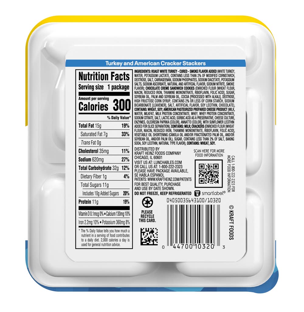 Built to be eaten, our Lunchables Turkey and American Cheese Cracker Stackers Snack Kit tray is the perfect option for a convenient snack kids will enjoy any time of day! Our snack kit features real, epic food including white meat only Oscar Mayer lean turkey, Kraft American pasteurized prepared cheese product and crackers. Enjoy delectable chocolate creme sandwich cookies for a dessert treat. Great for on the go, each ingredient comes in an individual compartment in our serving tray, making it easy and fun to build your own unique combinations. Every 3.2 ounce tray contains 11 grams of protein per serving. Always remember to keep your Lunchables Turkey and American Cracker Stackers refrigerated until you are ready to experience a delicious snack.