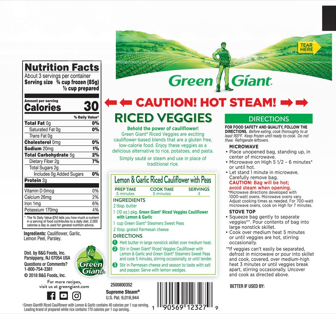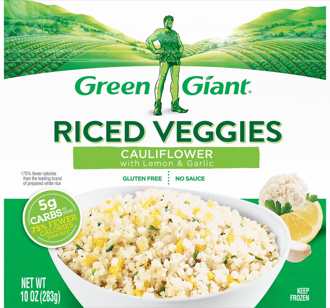 5 g carbs per serving. 75% Fewer calories than rice (75% fewer calories than the leading brand of prepared white rice). (Green Giant Riced Cauliflower with Lemon & Garlic contains 40 calories per 1 cup serving. Leading brand of white rice contains 170 calories per 1 cup serving). Gluten free. No sauce. Riced veggies. Behold the power of cauliflower! Green Giant Riced Veggies are exciting cauliflower-based blends that are a gluten free, low-calorie food. Enjoy these veggies as a delicious alternative to rice, potatoes, and pasta. greengiant.com. Facebook. YouTube. Instagram. Questions or Comments? 1-800-754-3381. For more recipes, visit us at greengiant.com. B&G Foods, Inc, Parsippany, NJ, 07054