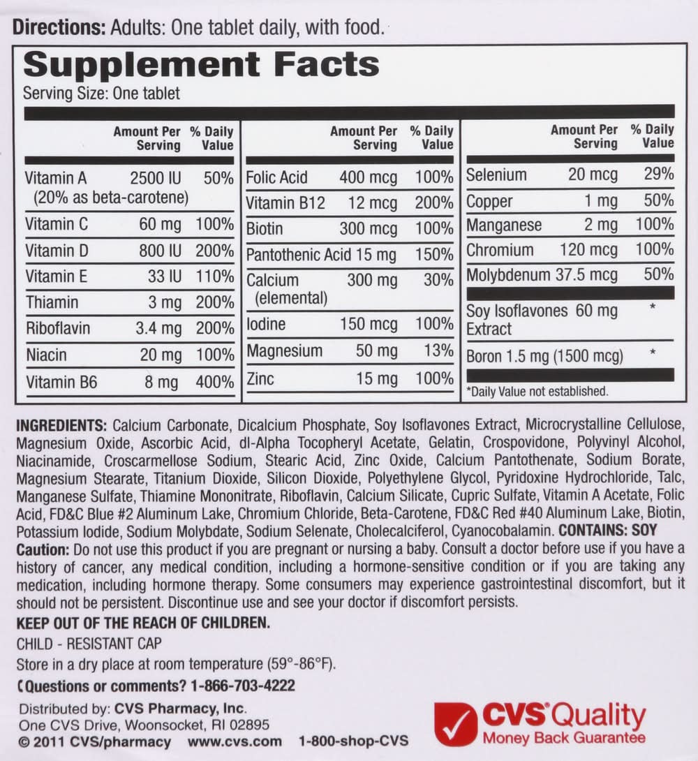 Calcium Carbonate, Dicalcium Phosphate, Soy Isoflavones Extract, Microcrystalline Cellulose, Magnesium Oxide, Ascorbic Acid, DL-Alpha Tocopheryl Acetate, Gelatin, Crospovidone, Polyvinyl Alcohol, Niacinamide, Croscarmellose Sodium, Stearic Acid, Zinc Oxide, Calcium Pantothenate, Sodium Borate, Magnesium Stearate, Titanium Dioxide, Silicon Dioxide, Polyethylene Glycol, Pyridoxine Hydrochloride, Talc, Manganese Sulfate, Thiamine Mononitrate, Riboflavin, Calcium Silicate, Cupric Sulfate, Vitamin A Acetate, Folic Acid, FD&C Blue 2 Aluminum Lake, Chromium Chloride, Beta-Carotene, FD&C Red 40 Aluminum Lake, Biotin, Potassium Iodide, Sodium Molybdate, Sodium Selenate, Cholecalciferol, Cyanocobalamin Contains: Soybeans