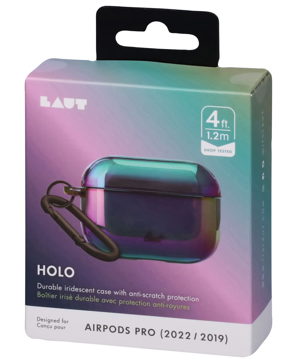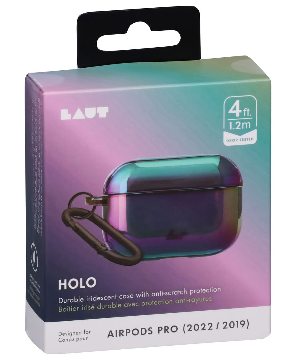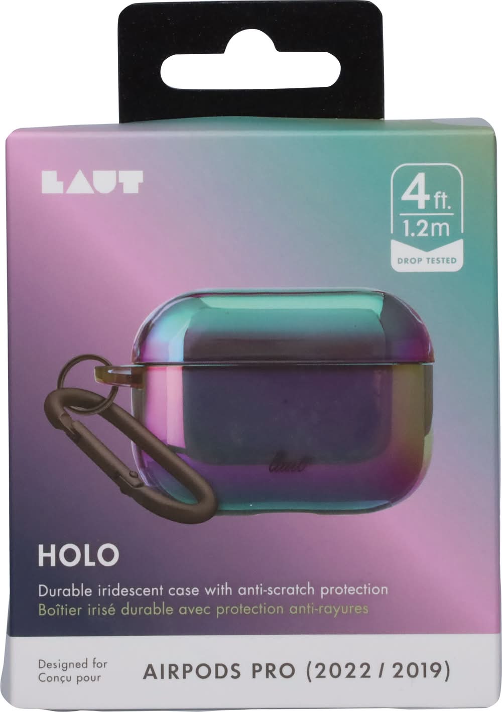 4 ft. 1.2 m. Holo Durable iridescent case with anti-scratch protection. Drop tested. Designed for. Durable and scratch resistant holo for airpods pro has iridescent finish that catches the light from every angle. Carabiner included. Anti scratch. Wireless charge compatible. Holo - Midnight. 2 Years warranty. For more information about warranty terms and conditions, please visit: www.itslaut.com/warranty. HE. www.itslaut.com. www.itslaut.com. Instagram. Facebook. Twitter. (at)itslaut. Packaging made from recyclable materials. FSC. Mix packaging from responsible sources www.fsc.org. Made in China.