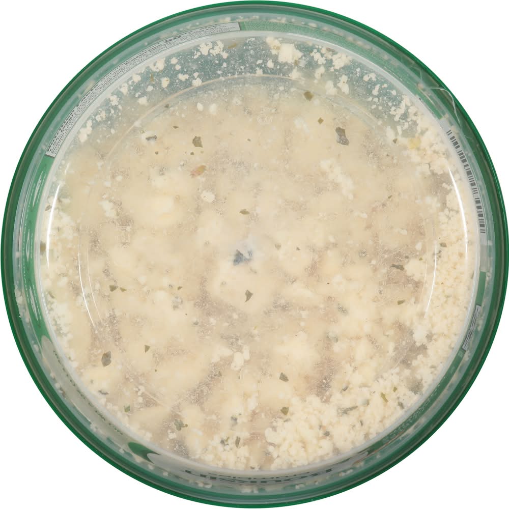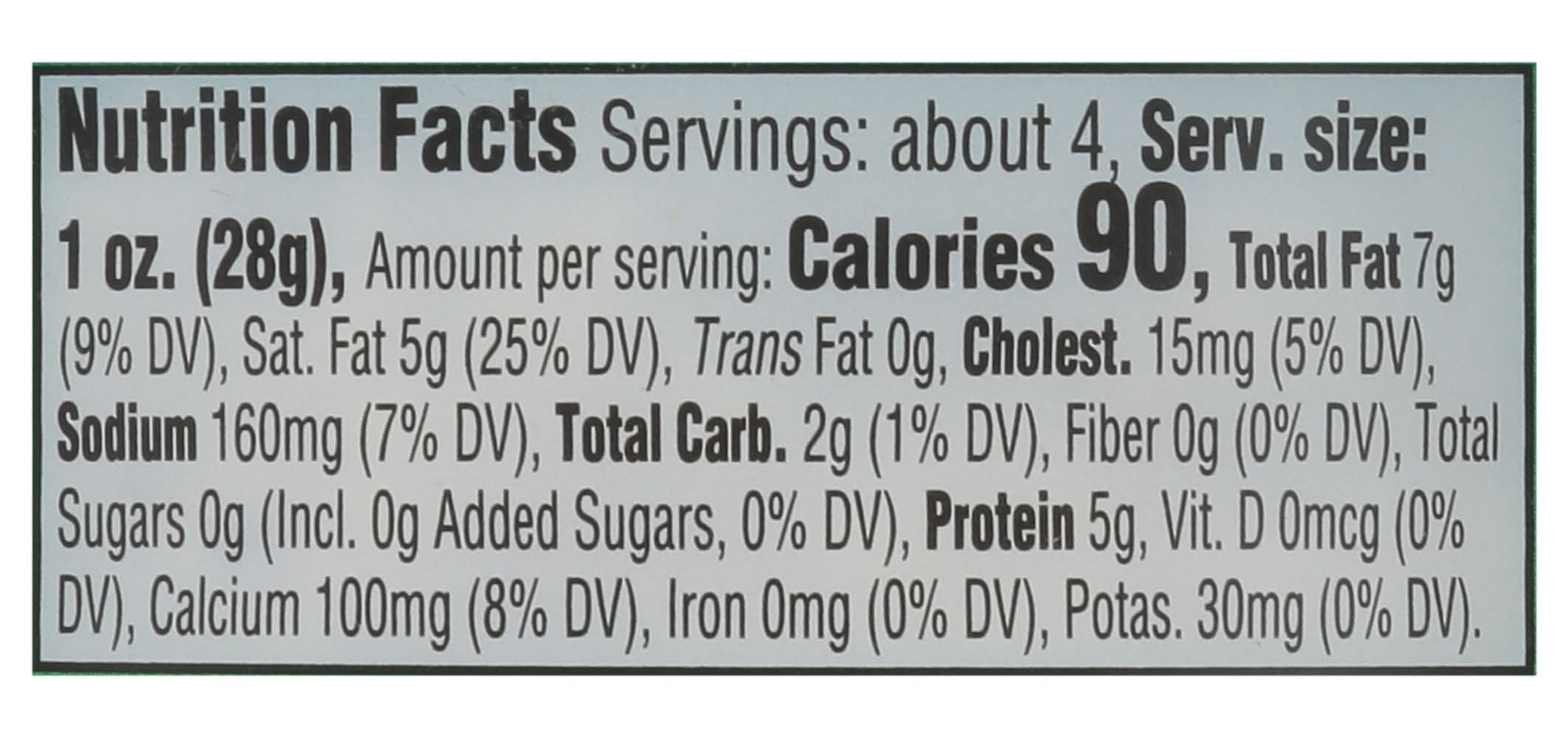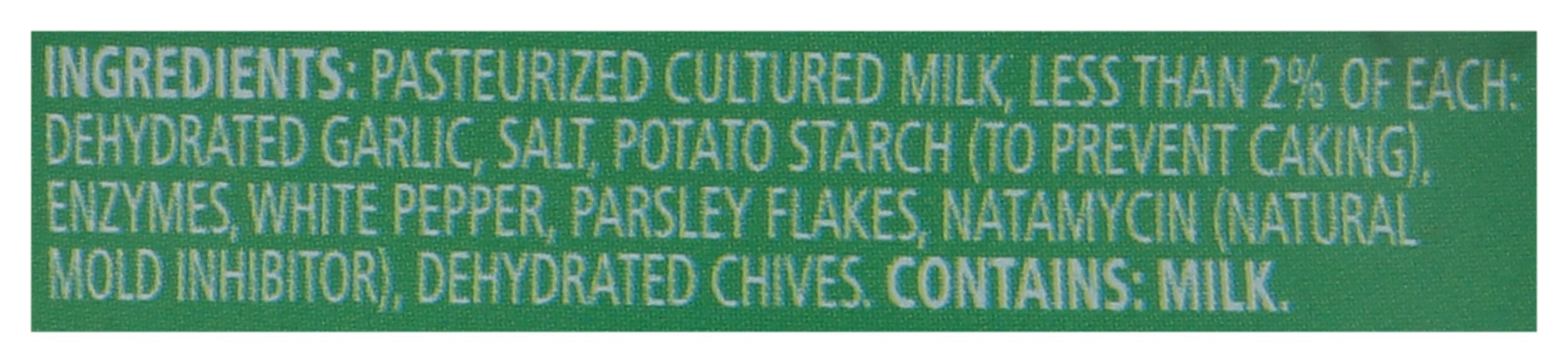 Ingredients: Pasteurized Cultured Milk, Less than 2% of Each: Dehydrated Garlic, Salt, Potato Starch (to Prevent Caking), Enzymes, White Pepper, Parsley Flakes, Natamycin (Natural Mold Inhibitor), Dehydrated Chives Contains: Milk
