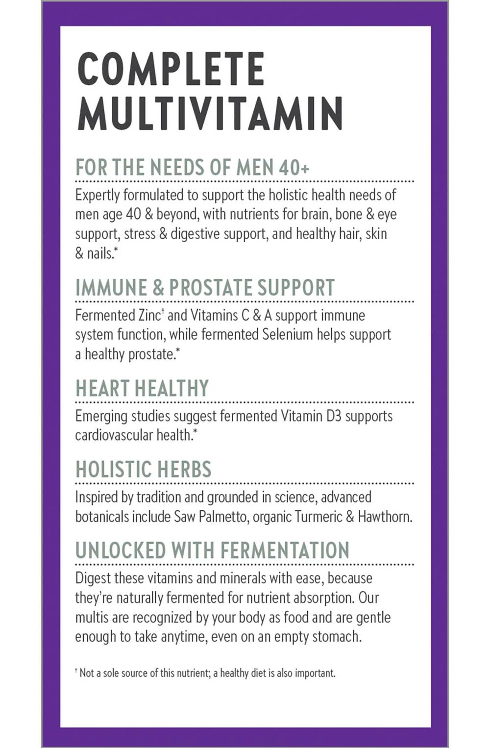 40+ MEN'S MULTIVITAMIN: Absorb the natural goodness of whole-food fermented nutrients formulated for your body to recognize as food ENERGY & IMMUNE SUPPORT: Designed to support men's health needs after 40, including nutrients for energy, immune, heart, brain, bone, stress, digestive & prostate health support + healthy hair, skin, and nails* ONE DAILY: Can be taken any time of day complete fermented multivitamin is easy to digest and gentle even on an empty stomach. No nausea. THE FERMENTED ADVANTAGE: New Chapter ferments key vitamins and minerals with probiotics and formulates our blends for optimal absorption Made with Certified Organic Vegetables & Herbs, Non-GMO Project Verified, 100% Vegetarian, Certified Kosher, Certified Gluten-Free by NSF, No Synthetic Fillers, Packaging may vary If you're looking fo