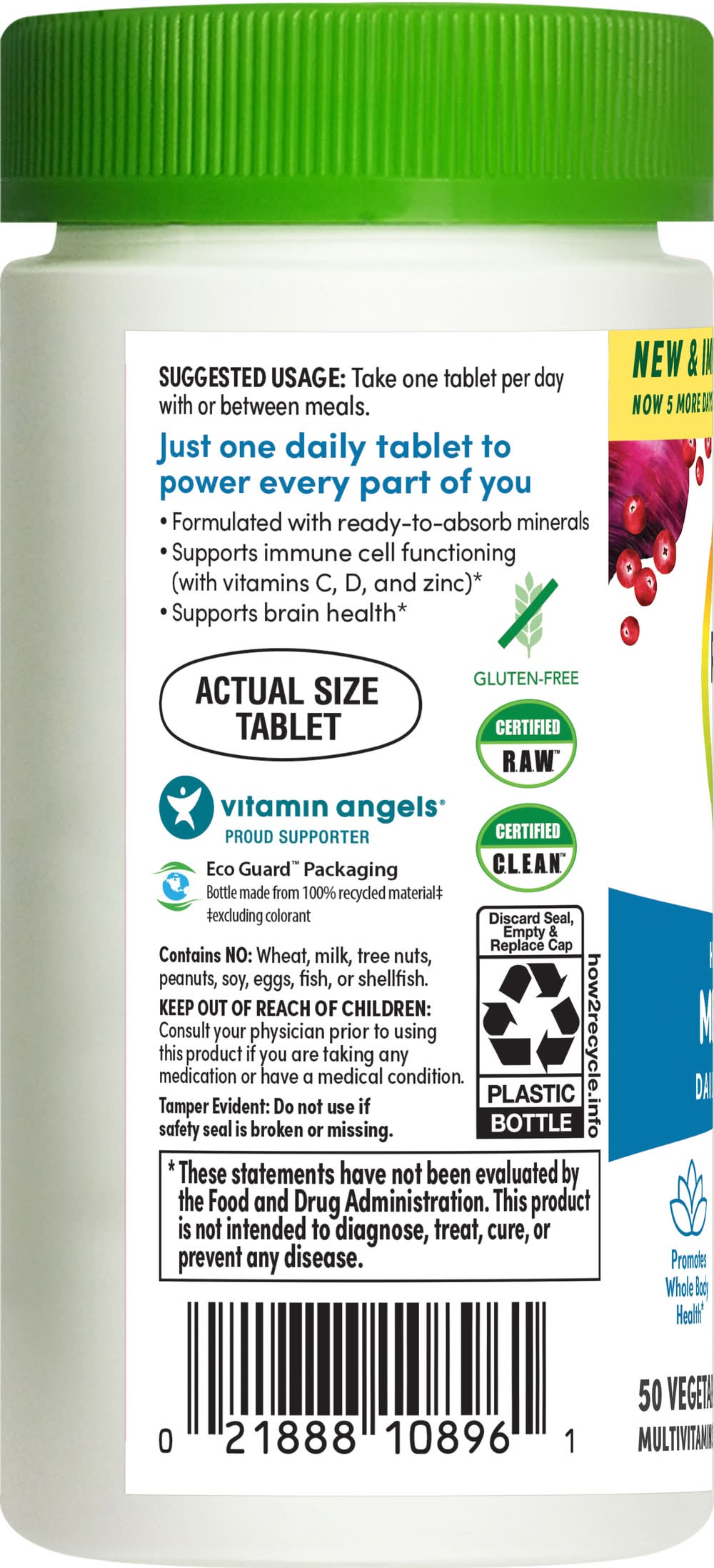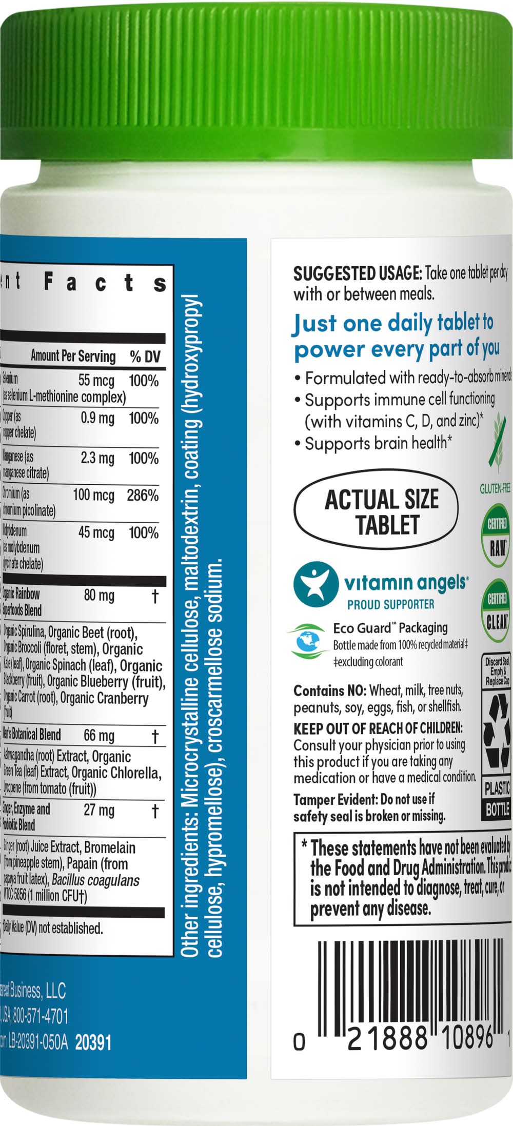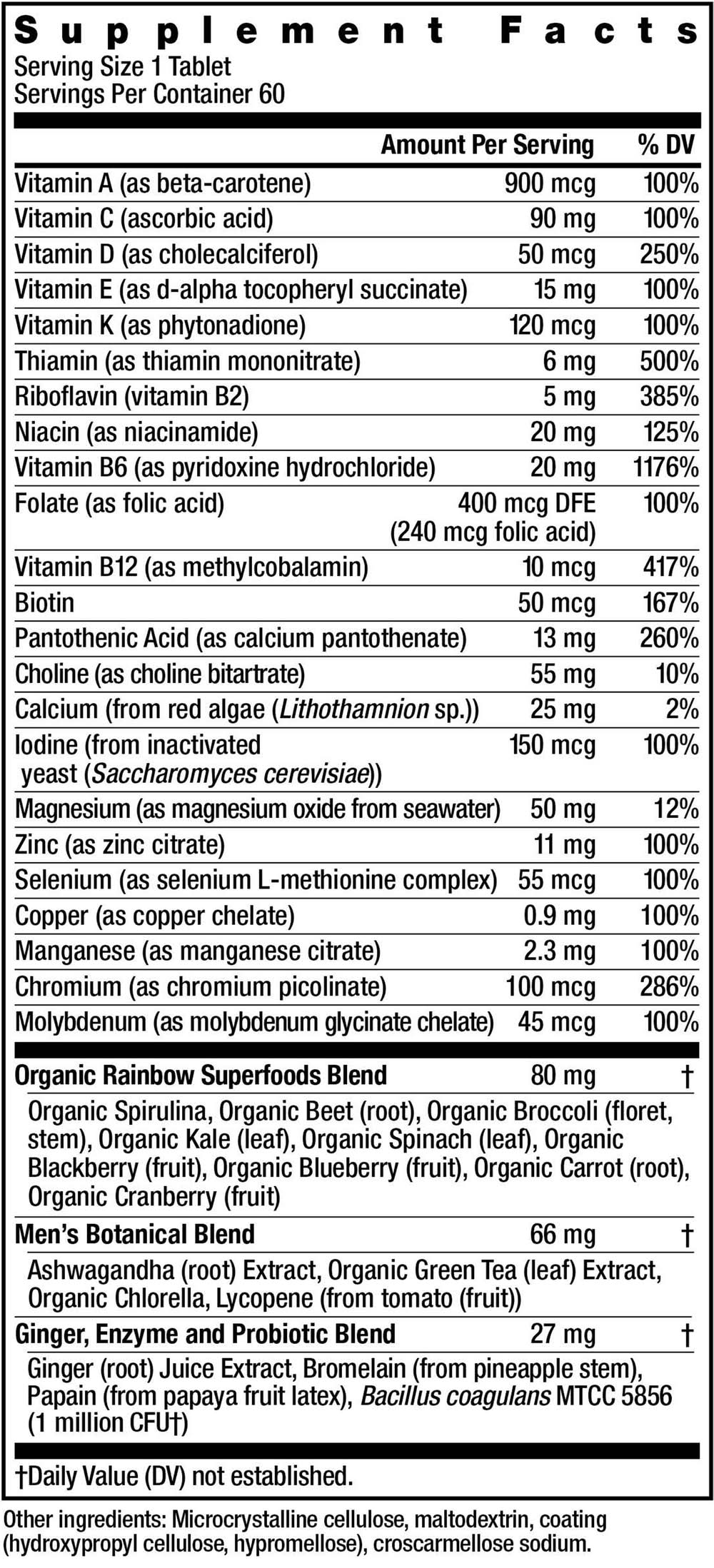 Vitamin A (as beta-carotene, Vitamin C (ascorbic acid), Vitamin D (as cholecalciferol), Vitamin E (as d-alpha tocopheryl succinate), Vitamin K (as phytonadione), Thiamin (as thiamin mononitrate), Riboflavin (vitamin B2), Niacin (as niacinamide), Vitamin B6 (as pyridoxine hydrochloride), Folate (as folic acid) 400 mcg DFE (240 mcg folic acid), Vitamin B12 (as methylcobalamin), Biotin, Pantothenic Acid (as calcium pantothenate), Choline (as choline bitartrate), Calcium (from red algae (Lithothamnion sp.)), Iodine (from inactivated yeast (Saccharomyces cerevisiae)), Magnesium (as magnesium oxide from seawater), Zinc (as zinc citrate), Selenium (as selenium L-methionine complex), Copper (as copper chelate), Manganese (as manganese citrate), Chromium (as chromium picolinate), Molybdenum (as molybdenum glycinate chelate), Organic Spirulina, Organic Beet (root), Organic Broccoli (floret, stem), Organic Kale (leaf), Organic Spinach (leaf), Organic Blackberry (fruit), Organic Blueberry (fruit), Organic Carrot (root), Organic Cranberry (fruit), Ashwagandha (root) Extract, Organic Green Tea (leaf) Extract, Organic Chlorella, Lycopene (from tomato (fruit), Ginger (root) Juice Extract, Bromelain (from pineapple stem), Papain (from papaya fruit latex), Bacillus coagulans MTCC 5856. Other ingredients: Microcrystalline cellulose, maltodextrin, coating (hydroxypropyl cellulose, hypromellose), croscarmellose sodium.