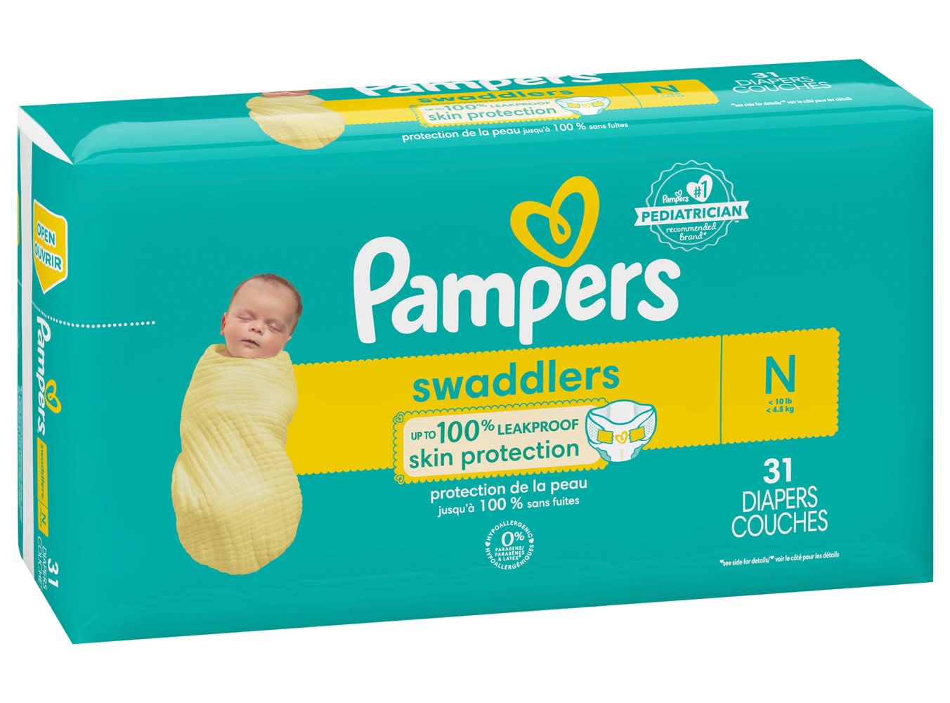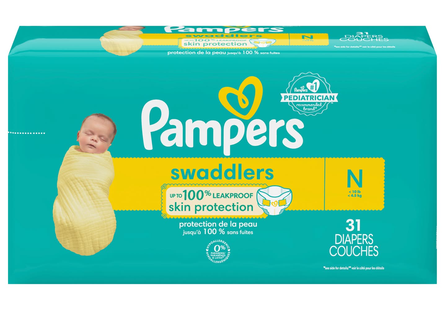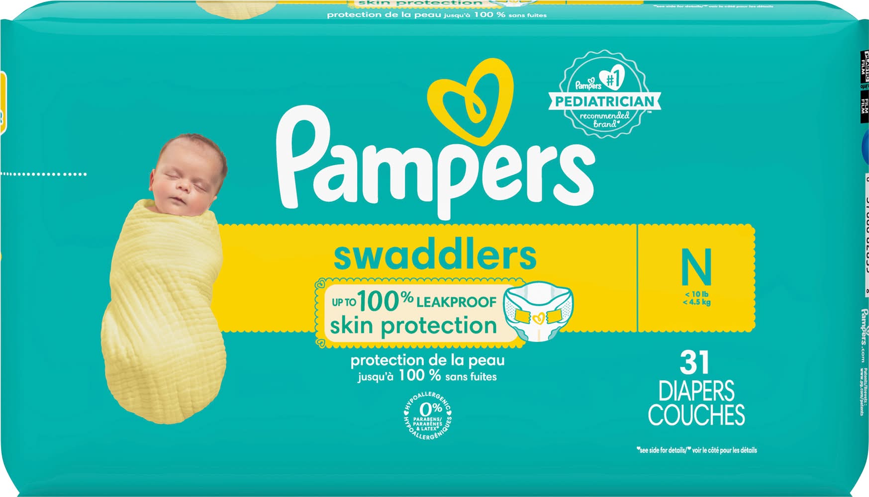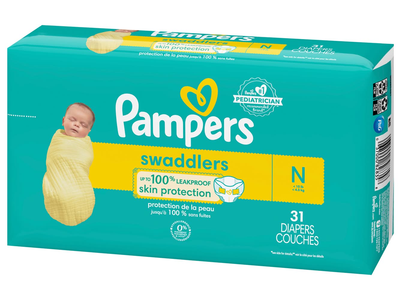 New & improved Product and packaging may vary. What keeps baby's skin healthy A diaper that doesn't leave skin wet. That's why new and improved Pampers Swaddlers absorb wetness better and provide up to 100% leakproof skin protection to help keep your baby's skin healthy and protected. New Pampers Swaddlers are designed with a Wrap & Protect Waistband that gently wraps around baby to help protect skin from irritation—and Wrap & Protect leg barriers that protect where leaks happen most. For trusted protection, trust Pampers Swaddlers, the #1 Choice of U.S. Hospitals, Nurses, and Parents. Pampers Lock Away Channels lock wetness away for dry, healthy skin while the Breathe Free Liner wicks away wetness, allowing baby's skin to breathe. Plus, Pampers Swaddlers are Skin Health Alliance Dermatologist Approved, hypoallergenic, and free of parabens and latex,† so you can trust them to be safe and gentle on your little one's delicate skin. Pampers Swaddlers are available in sizes N-7 and come in a variety of sweet prints. • Procter & Gamble, Cincinnati,OH. • Packaging: Reusable