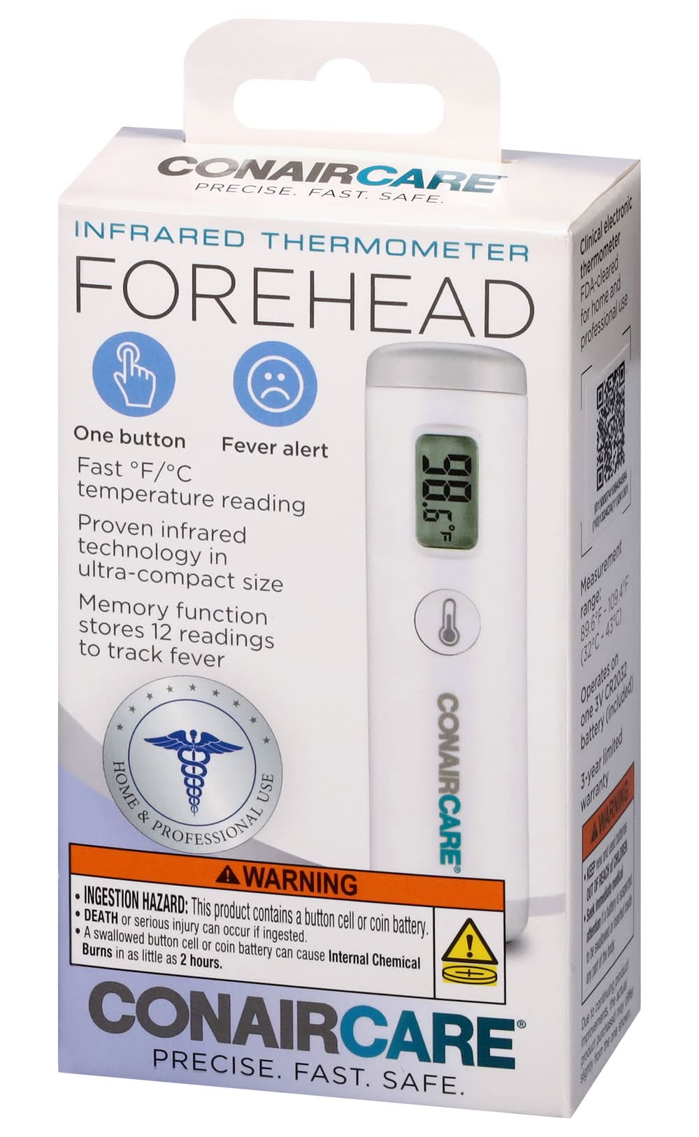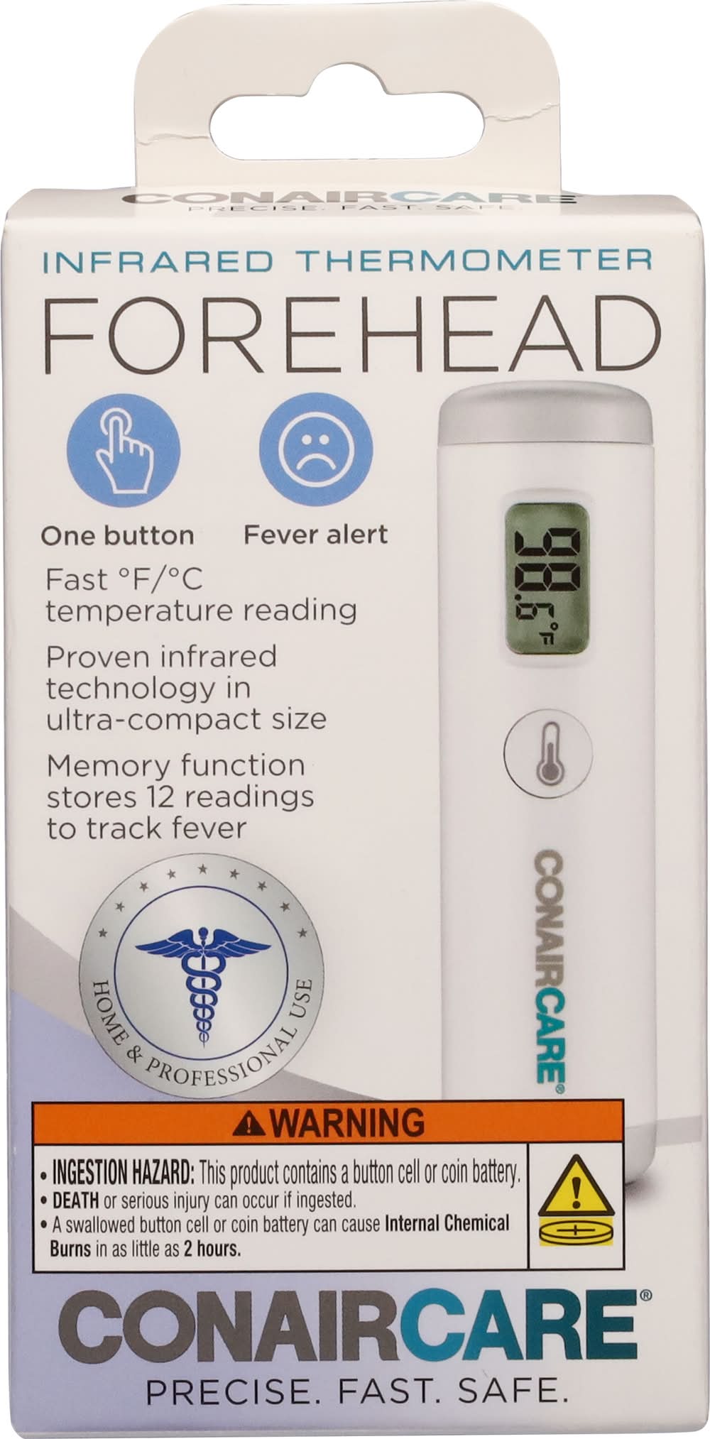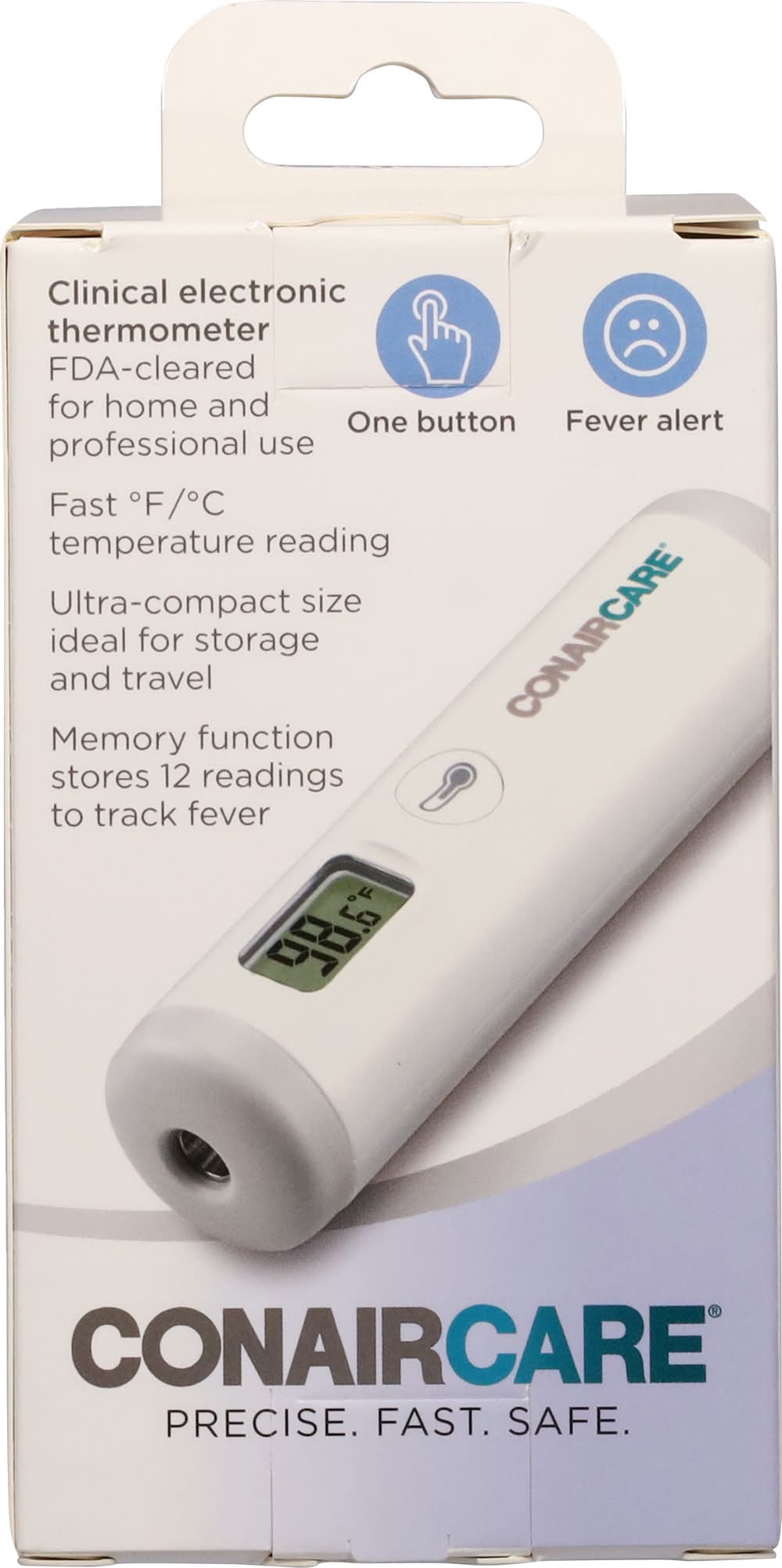 Accurate temperature measurement is essential for the health and wellbeing of your family. FDA cleared for home and professional use, this clinical electronic thermometer makes it safe and easy to measure and track temperatures, so you can gain peace of mind. Designed with Infrared technology to provide precise temperature readings in Fahrenheit or Celsius, this ultra-compact essential operates without contact. Just press the button, aim 1 - 2 inches away from the forehead and press the button once more to measure temperature, which appears on a large LCD display. Low and high-level fever alerts are included, as well as a memory function that stores up to 32 readings to track progress. Precise, safe, and fast, with a measurement range of 89.6F -109.4F (32C - 43C), the Conaircare infrared thermometer is a must for today's households and office. Includes 1 long-life CR2032 battery. Clinical electronic thermometer FDA-cleared for home and professional use Proven infrared technology in ultra-compact size Fast °F /°C temperature reading Fever alert 2 temperature alert settings for low- and high-grade fever Ultra-compact size ideal for storage and travel Memory function stores 12 readings to track fever.