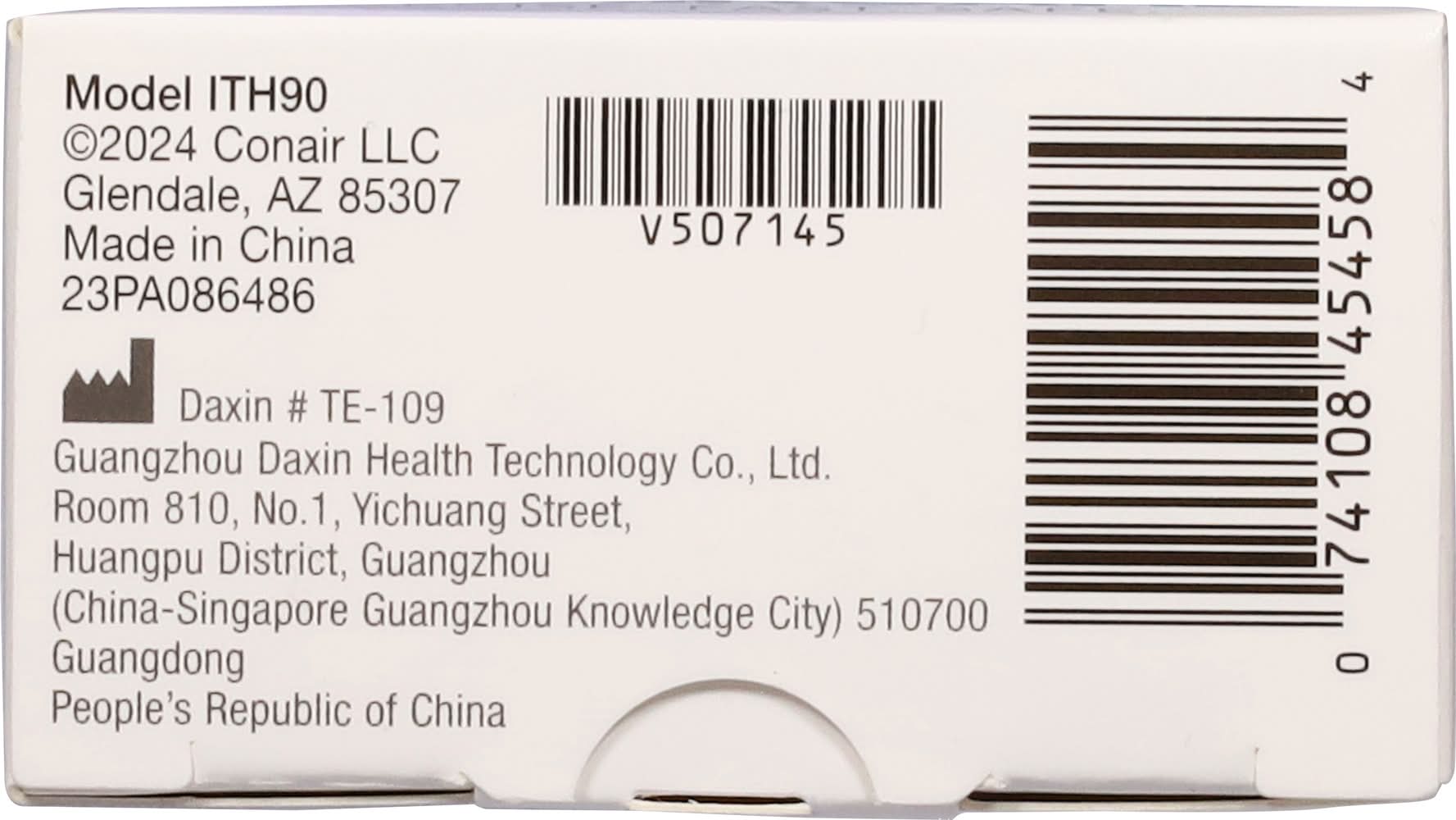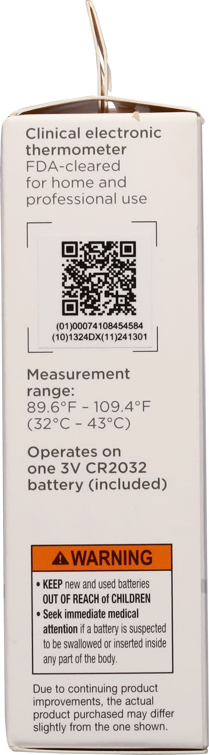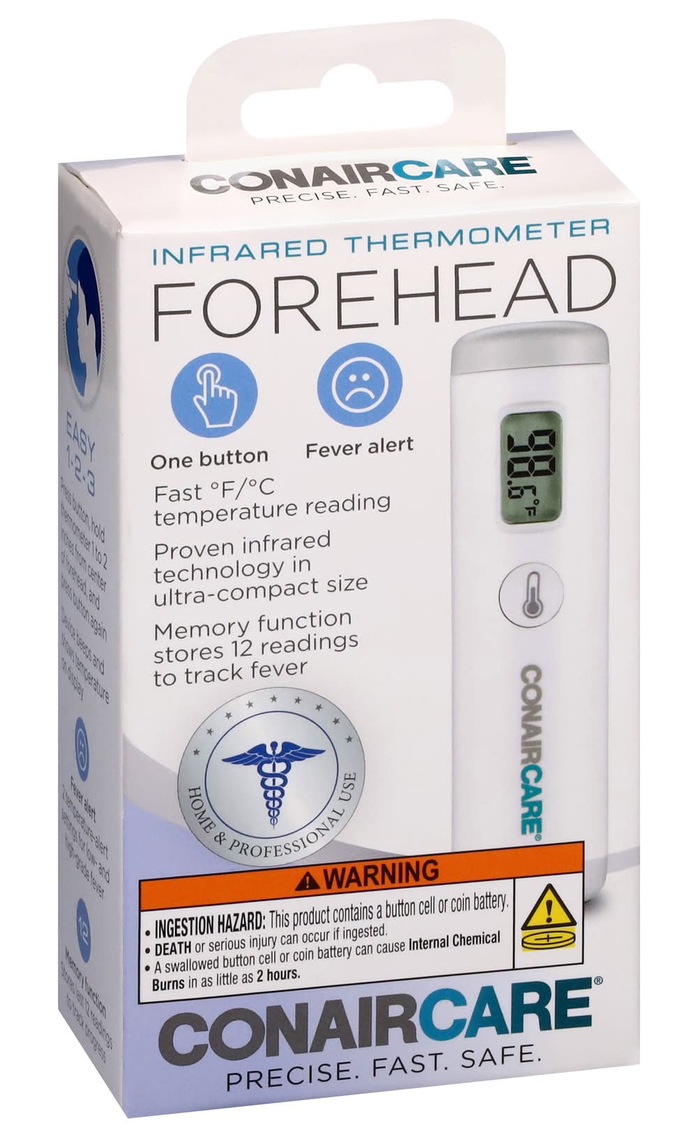 Accurate temperature measurement is essential for the health and wellbeing of your family. FDA cleared for home and professional use, this clinical electronic thermometer makes it safe and easy to measure and track temperatures, so you can gain peace of mind. Designed with Infrared technology to provide precise temperature readings in Fahrenheit or Celsius, this ultra-compact essential operates without contact. Just press the button, aim 1 - 2 inches away from the forehead and press the button once more to measure temperature, which appears on a large LCD display. Low and high-level fever alerts are included, as well as a memory function that stores up to 32 readings to track progress. Precise, safe, and fast, with a measurement range of 89.6F -109.4F (32C - 43C), the Conaircare infrared thermometer is a must for today's households and office. Includes 1 long-life CR2032 battery. Clinical electronic thermometer FDA-cleared for home and professional use Proven infrared technology in ultra-compact size Fast °F /°C temperature reading Fever alert 2 temperature alert settings for low- and high-grade fever Ultra-compact size ideal for storage and travel Memory function stores 12 readings to track fever.