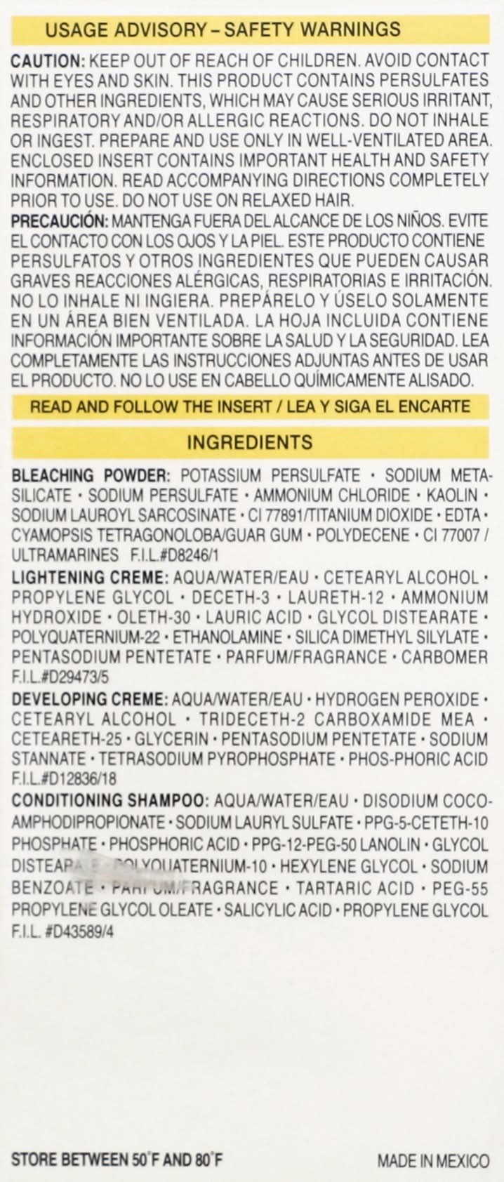 Bleaching Powder: Potassium Persulfate, Sodium Metasilicate, Sodium Persulfate, Ammonium Chloride, Kaolin, Sodium Lauroyl Sarcosinate, CI 77891/Titanium Dioxide, EDTA, Cyamopsis Tetragonoloba/Guar Gum, Polydecene, CI 77007/Ultramarines. Lightening Creme: Aqua/Water/Eau, Cetearyl Alcohol, Propylene Glycol, Deceth-3, Laureth-12, Ammonium Hydroxide, Oleth-30, Lauric Acid, Glycol Distearate, Polyquaternium-22, Ethanolamine, Silica Dimethyl Silylate, Pentasodium Pentetate, Parfum/Fragrance, Carbomer. Developing Creme: Aqua/Water/Eau, Hydrogen Peroxide, Cetearyl Alcohol, Trideceth-2 Carboxamide MEA, Ceteareth-25, Glycerin, Pentasodium Pentetate, Sodium Stannate, Tetrasodium Pyrophosphate, Phosphoric Acid. Conditioning Shampoo: Aqua/Water/Eau, Disodium Cocoamphodipropionate, Sodium Lauryl Sulfate, PPG-5-Ceteth-10 Phosphate, Phosphoric Acid, PPG-12-PEG-50 Lanolin, Glycol Distearate, Polyquaternium-10, Hexylene Glycol, Sodium Benzoate, Parfum/Fragrance, Tartaric Acid, PEG-55 Propylene Glycol Oleate, Salicylic Acid, Propylene Glycol Contains: NONE Additives: NONE