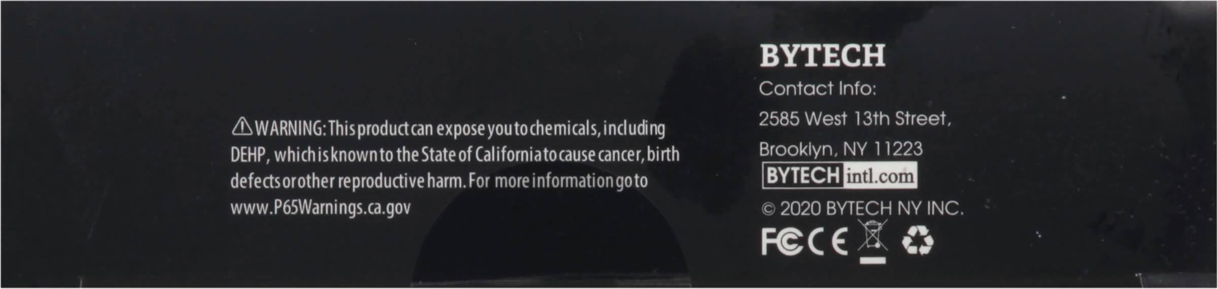 The art of technology. Dual USB ports. Solar powered flashlight. Solar powered. Waterproof surface. Micro USB cable included. Features: Compatible with most popular smarphone devices, tablets and other USB charged devices (Photos are for illustration purposes only). Solar energy charging and LED flashlight function. 2 USB ports allow for double charging. Portable design allows you to easily hang it on your backpack with the strap or be hands-free while on-the-go. 4000 mAh allows up to 2 full charges for most smartphones. Water resistant and shockproof design. Specification: Battery capacity: 606090 4000mAh. Solar power:0.5W. Micro input: 5V/1A. Output: 5V/1A. 606090 polymer lithium battery not included. Package includes: 4000 mAh solar dual power bank. USB micro cable. Manual. Warranty - 12 Months. Please visit our website Bytechintl.com/warranty. CE listed. FCC listed. Bytechintl.com/warranty. www.P65Warnings.ca.gov. bytechintl.com. Contact Info: 2585 West 13th Street, Brooklyn, NY 11223. bytechintl.com. Made in China. • Bytech NY Inc., • Packaging: Reusable