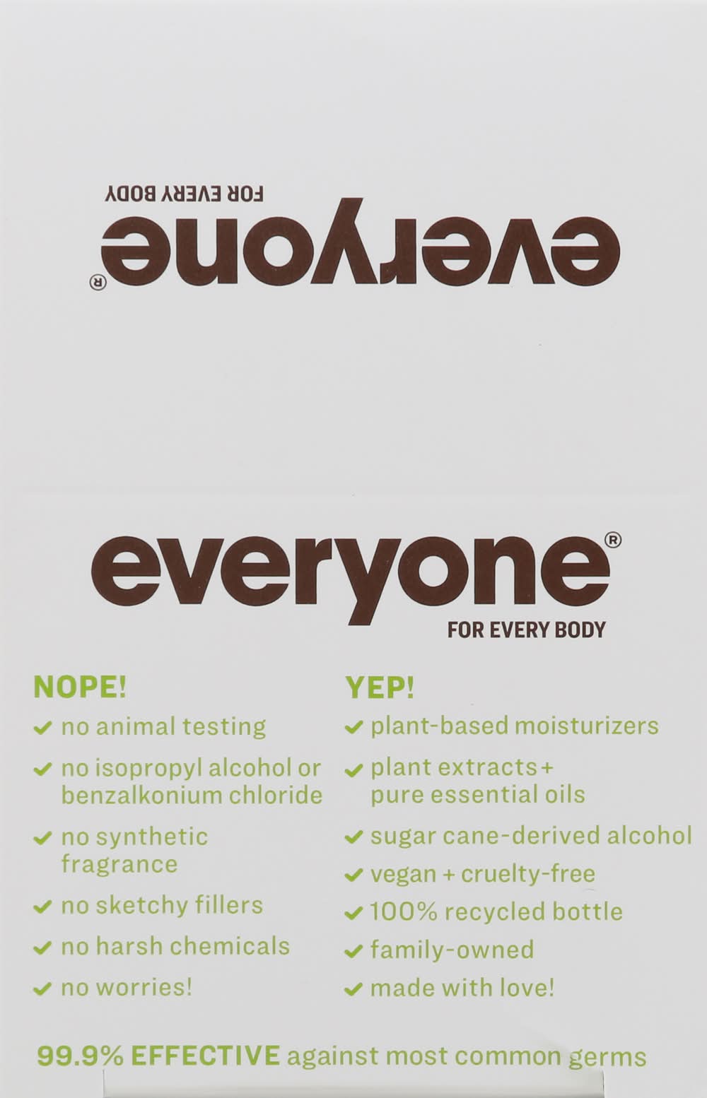 Vegan. For every body. Nope! No isopropyl alcohol or benzalkonium chloride. No synthetic fragrance. No sketchy fillers. No harsh chemicals. No worries! Yep! Plant-based moisturizers. Plant extracts + pure essential oils. Sugar cane-derived alcohol. 100% recycled bottle. Family-owned. Made with love! 99.9% effective against most common germs. Everyone is welcome. EO products. Everyone loves clean hands. eoproducts.com. Follow us: Instagram: everyoneproducts. Certified B Corporation. Cruelty free. No animal testing. 100% recycled bottle. Made in the USA from domestic and globally sourced components. Small World Trading,