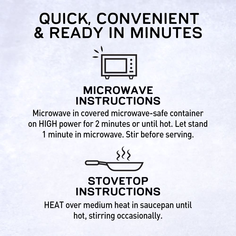 Directions: heating directions: microwave: microwave in covered microwave-safe container on high power 2 minutes or until hot. let stand 1 minute in microwave. stir before serving. stove top: heat over medium heat in a saucepan until hot, stirring occasionally. do not add water.