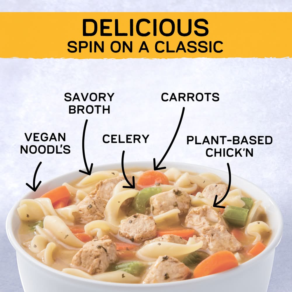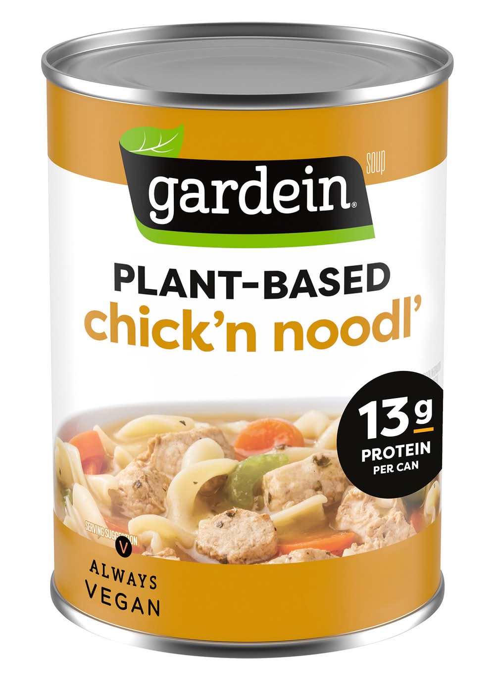 Enjoy this delicious spin on classic chicken noodle soup: Gardein Plant-Based Chick'n Noodl' Soup. This cozy favorite is loaded with tender chunks of plant-based chick’n, plump vegan noodl’s, carrots and celery in a sippable, slurpable, savory broth. Certified vegan and non-GMO, this mouthwatering soup provides 13 grams of protein per can. Indulge in plant-based goodness, because where there's protein rooted in plants, there's Gardein. • Flavor: Chick'n noodl • Packaging: Reusable