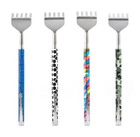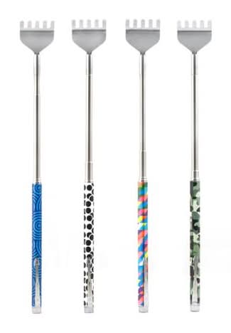 No need to rely on anyone else to scratch your back when you've got this handy telescoping back scratcher. Available in assorted patterns. 1.2" x 7" x 0.5" (3cm x 18cm x 1.3cm). 1 back scratcher (pattern will vary). Extends up to 20" (50 cm). Stainless steel.