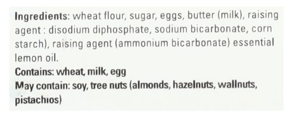 Wheat Flour, Sugar, Eggs, Butter (Milk), Raising Agent: Disodium Diphosphate, Sodium Bicarbonate, Corn Starch), Raising Agent (Ammonium Bicarbonate) Essential Lemon Oil Contains: Wheat, Milk, Eggs, Soybeans, Tree Nuts, Almonds, Tree Nuts, Hazelnuts/Filberts, Tree Nuts, Walnuts/Butternuts, Tree Nuts, Pistachios