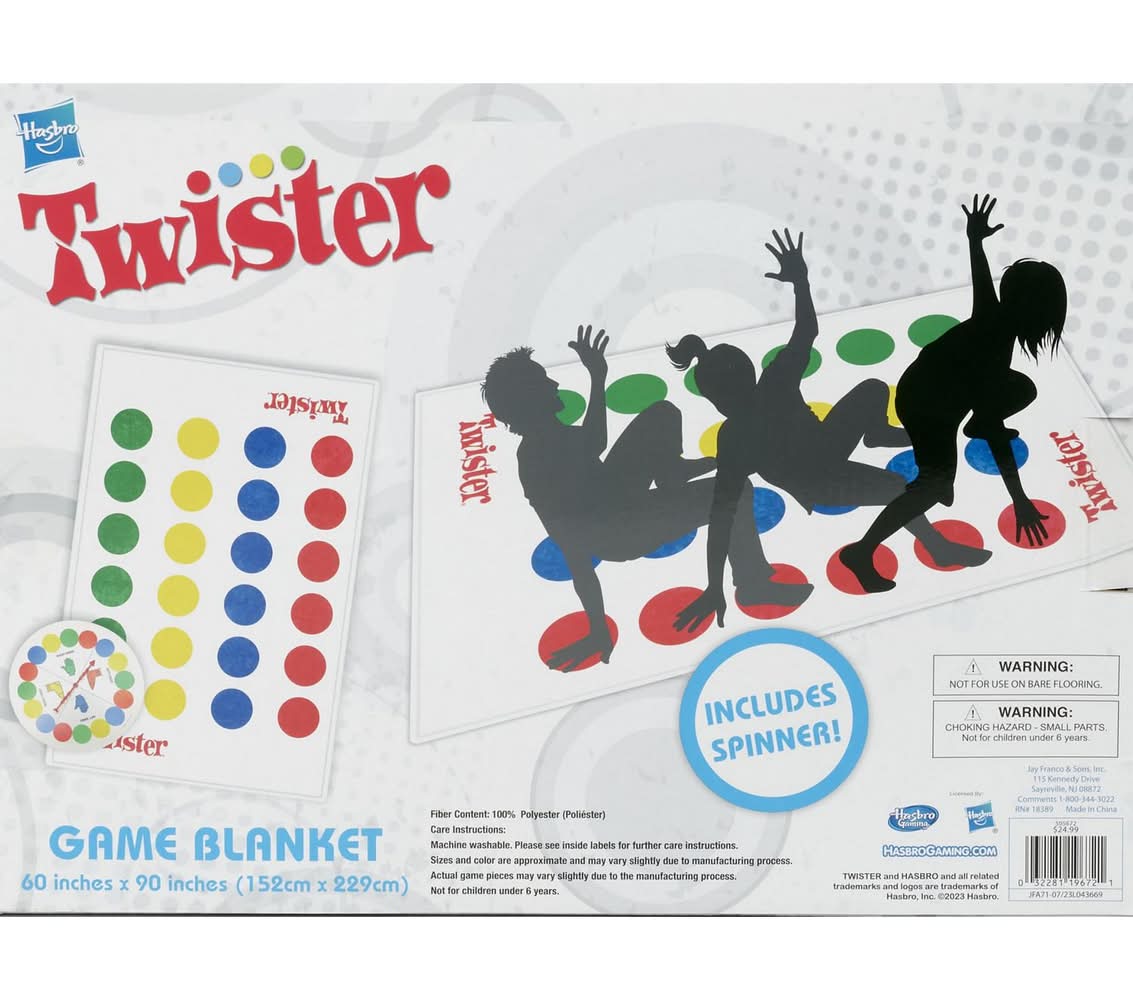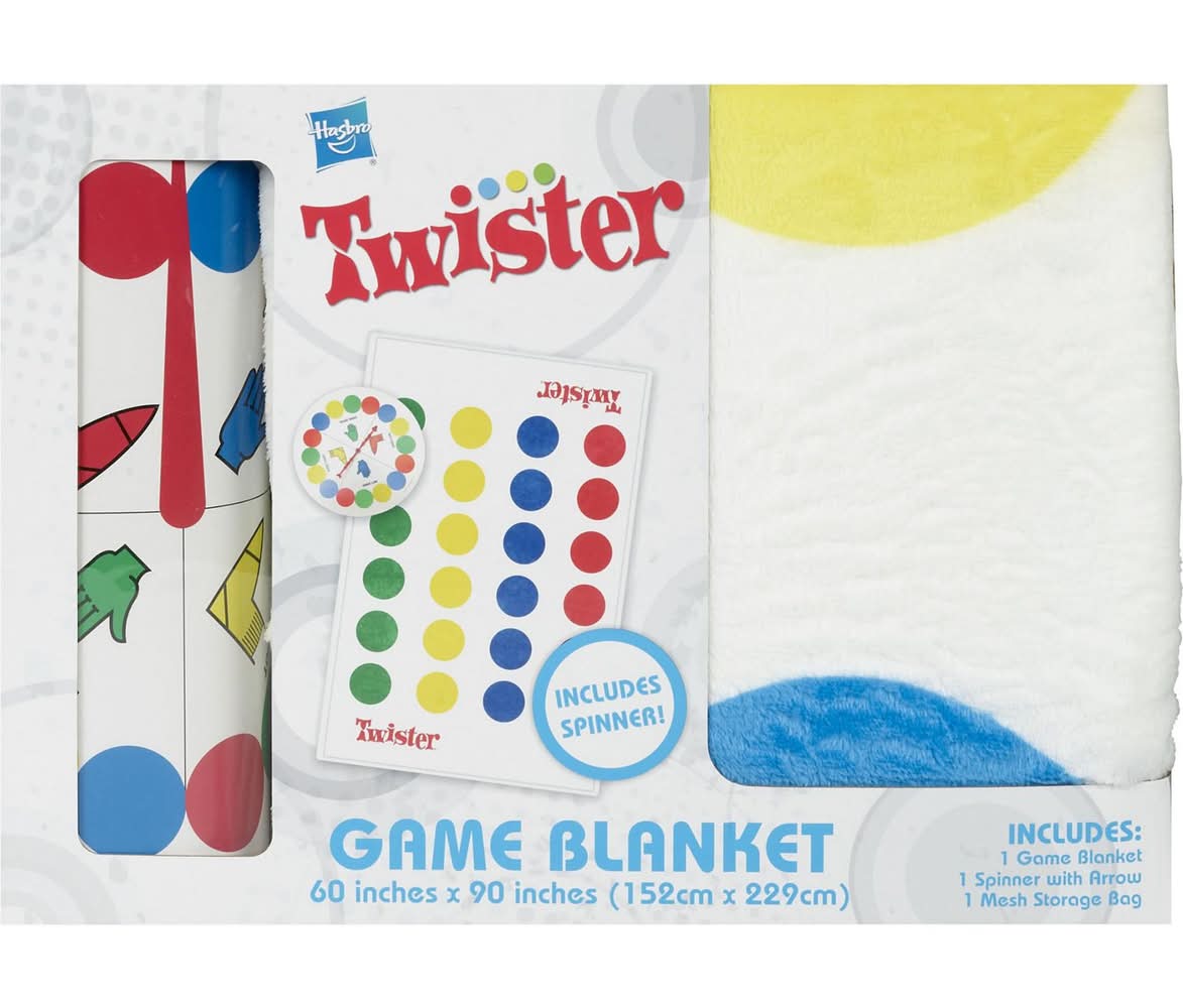 Whether it is playtime or naptime this set is all you need. Blanket is printed with a Twister board game. Set also includes spinner with base. Cozy up under the soft blanket when not playing Take turns doing the moves the spinner calls out. The first spin is for player 1, the second spin is for player two. Blanket is 60x90 Blanket only is machine washable in cold water with like colors Size: 60" x 90"