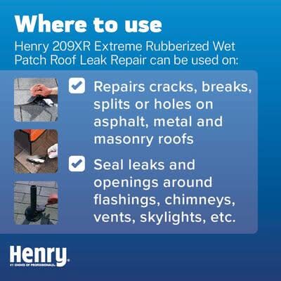 Henry 209XR Extreme Rubberized Wet Patch Roof Leak Repair is an ultra-premium, rubberized roof sealant with excellent adhesion, especially at moving joints where its flexibility and elasticity make it superior to standard roof cements. Instantly stops leaks in severe weather conditions. Especially easy to spread in cold temperat This product can expose you to chemicals including Benz[a]anthracene, which is known to the State of California to cause cancer. For more information go to: www.P65Warnings.ca.gov.