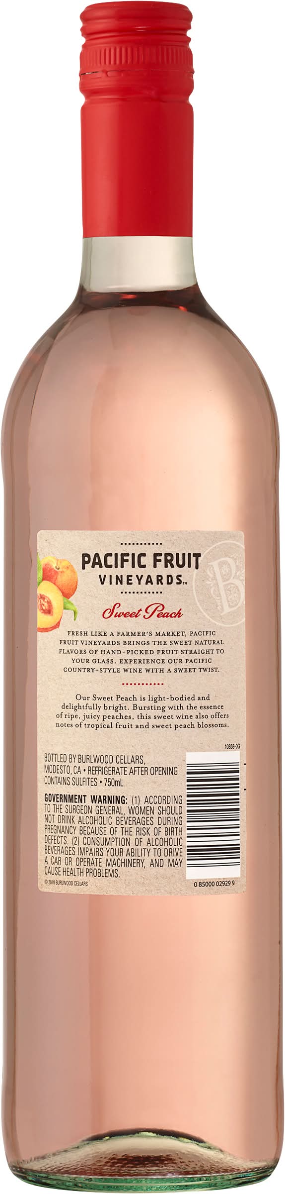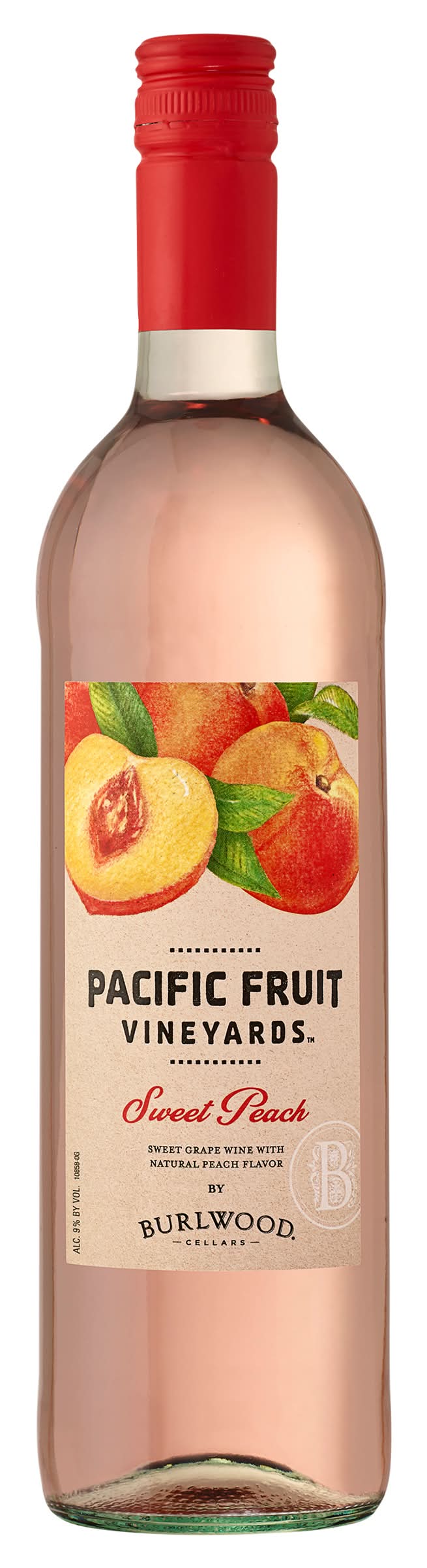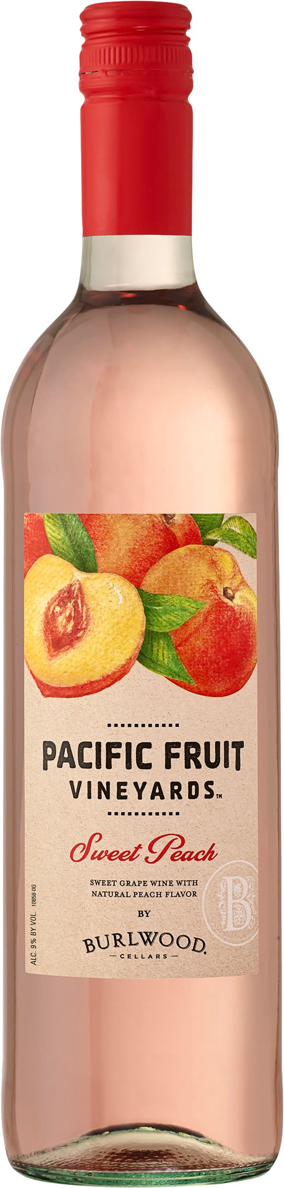 Sweet grape wine with natural peach flavor. Fresh like a farmer's market, pacific fruit vineyards brings the sweet natural flavors of hand-picked fruit straight to your glass. Experience our Pacific country-style wine with a sweet twist. Our Sweet Peach is light-bodied and delightfully bright. Bursting with the essence of ripe, juicy peaches, this sweet wine also offers notes of tropical fruit and sweet peach blossoms. Alc. 9% by vol. 18 Bottled by Burlwood Cellars, Modesto, CA. • Alcohol by volume: 9% • Burlwood Cellars,