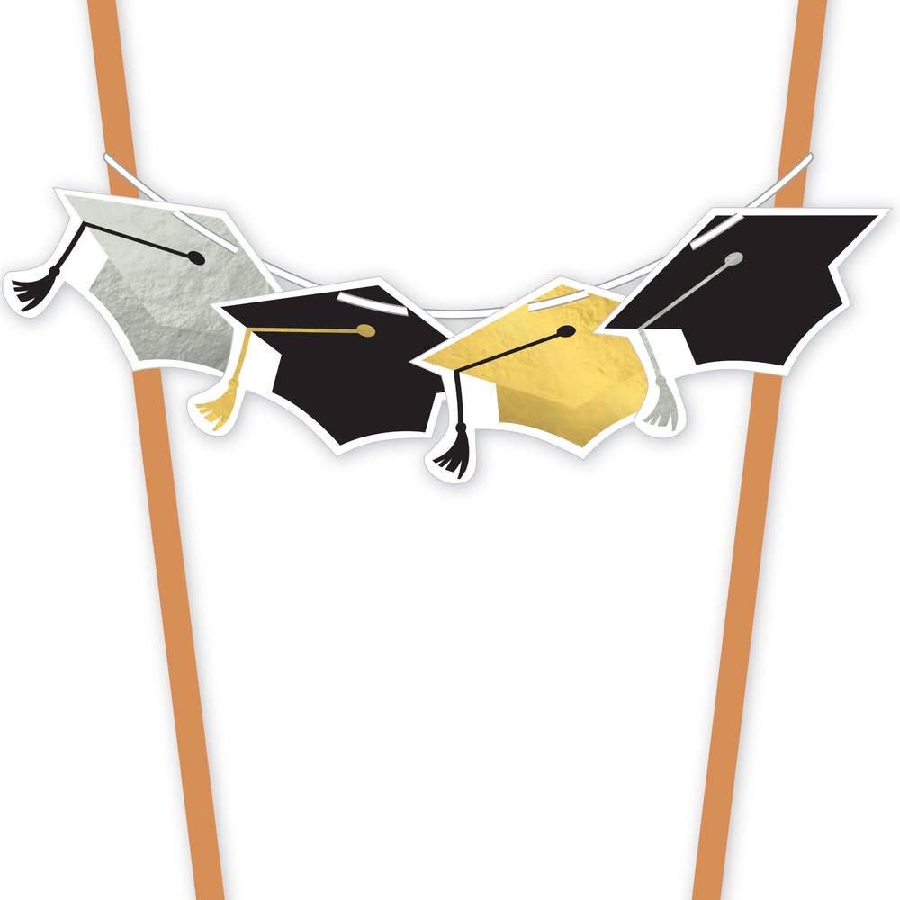 Top the graduation cake with a decoration that's perfect for occasion! This Graduation Cap Garland Cake Topper features black, silver, and gold graduation caps strung between two wooden picks. It instantly transforms a plain cake into a celebratory one, perfect to commemorate your grad's big achievement! pbBlack, Silver Gold Grad Cap Garland Cake Topper product details:/b/p ul li8.5in tall/li liMetallic details/li liCardstock and wood/li /ul