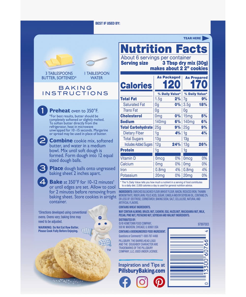 Pillsbury Traditional Sugar Cookie Mix is a convenient baking option that yields one dozen sugar cookies per package. Each serving contains 120 calories, 140 mg of sodium, which is 6% of the daily value, and 14 g of total sugars. The mix includes a bioengineered food ingredient. Nutritional information for the prepared product can be found on the packaging.