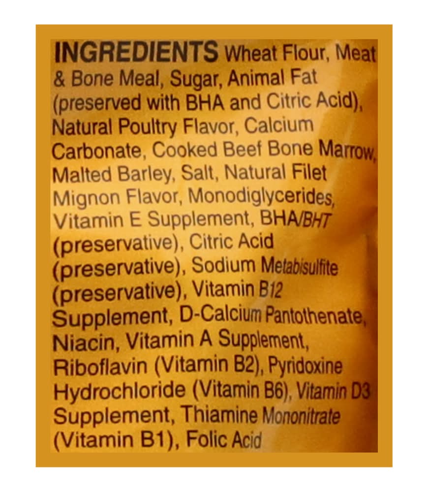 Ingredients: Wheat Flour, Meat & Bone Meal, Sugar, Animal Fat (Preserved with BHA and Citric Acid), Natural Poultry Flavor, Calcium Carbonate, Cooked Beef Bone Marrow, Malted Barley, Salt, Natural Filet Mignon Flavor, Monodiglycerides, Vitamin E Supplement, BHA/BHT (Preservative), Citric Acid (Preservative), Sodium Metabisulfite (Preservative), Vitamin B12 Supplement, D-Calcium Pantothenate, Niacin, Vitamin A Supplement, Riboflavin (Vitamin B2), Pyridoxine Hydrochloride (Vitamin B6), Vitamin D3 Supplement, Thiamine Mononitrate (Vitamin B1), Folic Acid Contains: Wheat, Barley, Sulfites