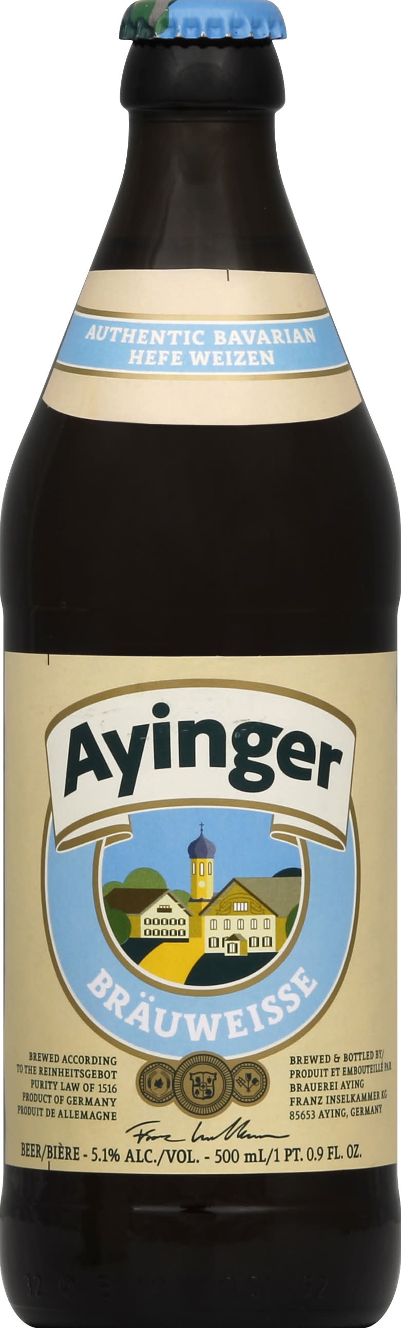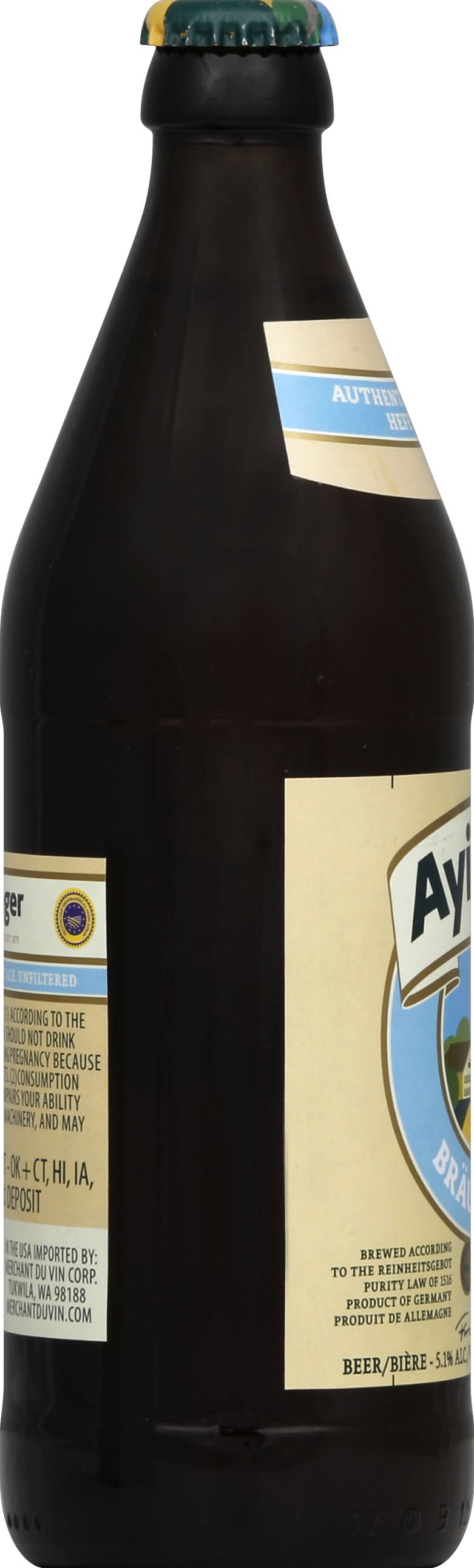 Ayinger Brau-Weisse is a wheat beer characterized by its lemon and vanilla aroma. It boasts a champagne-like effervescence and a sustained, creamy head. The beer presents a pale honey color and offers a tart, refreshing taste. It is bottle conditioned and top fermented, noted for its complex fruitiness and spicy, herbaceous nose with floral accents. To enjoy its full flavor, it is recommended to pour slowly and swirl the bottle to suspend the yeast before serving. Alcohol by volume: 5%