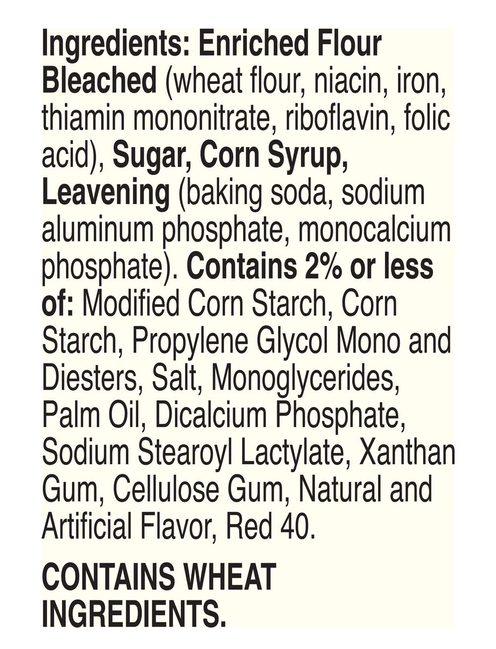 Ingredients: Enriched Flour Bleached (Wheat Flour, Niacin, Iron, Thiamin Mononitrate, Riboflavin, Folic Acid), Sugar, Corn Syrup, Leavening (Baking Soda, Sodium Aluminum Phosphate, Monocalcium Phosphate). Contains 2% or Less of: Modified Corn Starch, Corn Starch, Propylene Glycol Mono and Diesters, Salt, Monoglycerides, Palm Oil, Dicalcium Phosphate, Sodium Stearoyl Lactylate, Xanthan Gum, Cellulose Gum, Natural and Artificial Flavor, Red 40 Contains: Wheat