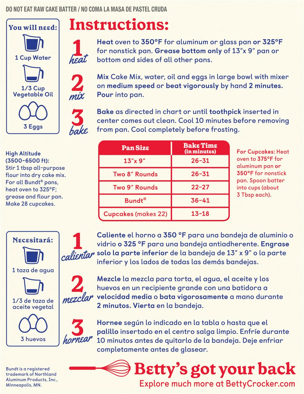 Directions: you will need: 1 cup water; 1/3 cup vegetable oil; 3 eggs. instructions: 1. heat oven to 350 degrees f for aluminum or glass pan or 325 degrees f for nonstick pan, grease bottom only of 13 inches x 9 inches pan or bottom and sides of all other pans, 2. mix cake mix, water, oil and eggs in large bowl with mixer on medium speed or beat vigorously by hand 2 minutes, pour into pan. 3. bake as directed in chart or until toothpick inserted in center comes out clean, cool 10 minutes before removing from pan, cool completely before frosting. high altitude (3500-6500 ft): stir 1 tbsp all-purpose flour into dry cake mix. for all bundt pans, heat oven to 325 degrees f; grease and flour pan. make 28 cupcakes. pan size: 13 inches x 9 inches - 26-31 bake time (in minutes); pan size: two 8 inches rounds - 26-31 bake time (in minutes); pan size: two 9 inches rounds - 22-27 bake time (in minutes); pan size: bundt - 36-41 bake time (in minutes); pan size: cupcakes (makes 22) - 13-18 bake time (in minutes). for cupcakes: heat oven to 375 degrees f for aluminum pan or 350 degrees f for nonstick pan. spoon batter into cups (about 3 tbsp each). do not eat raw cake batter. best if used by.