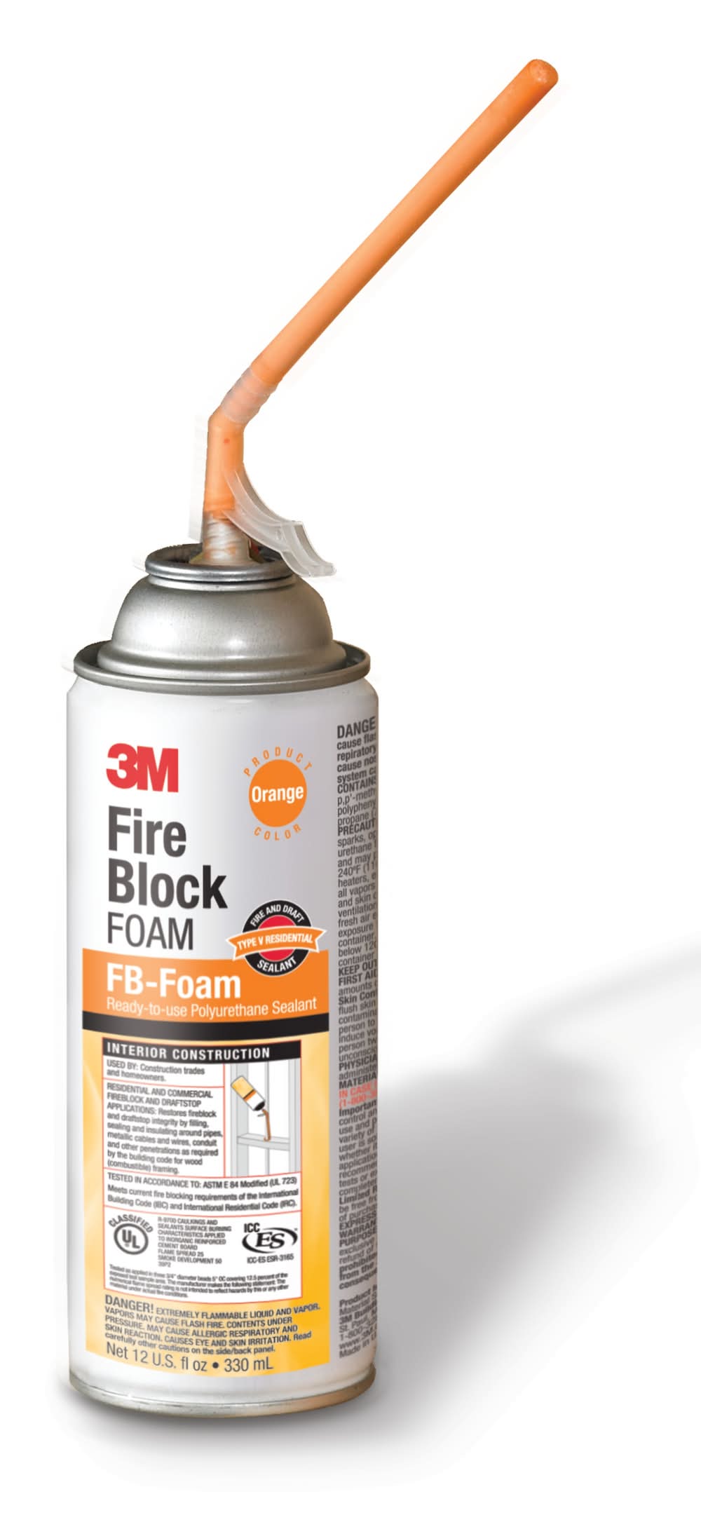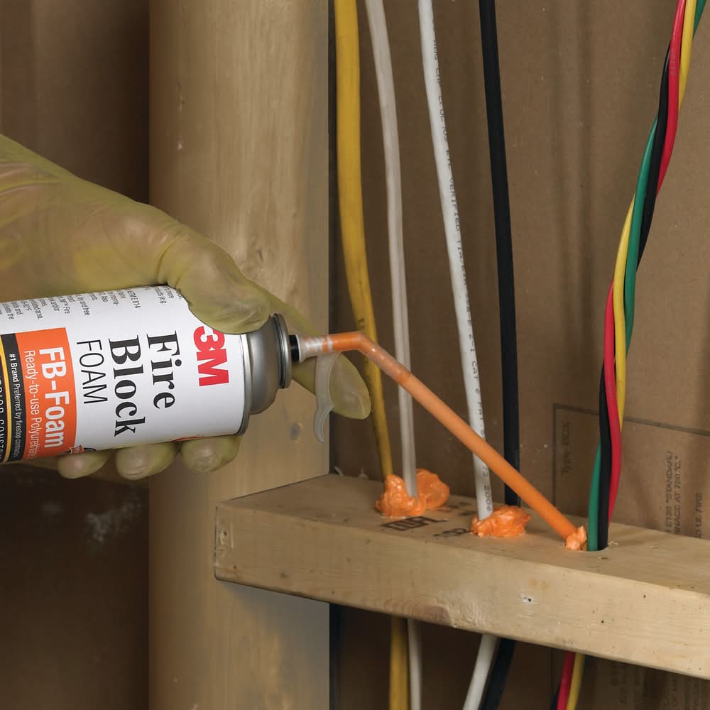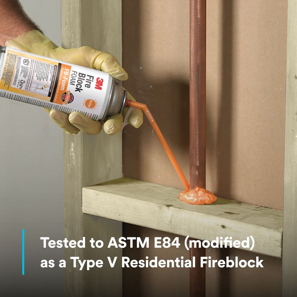 3M fire block foam FB-foam is a fire block and draft stop used to help seal, fill, insulate and bond for non-rated residential and commercial construction. This foam-in-place fire block is heat-resistant (up to 240°F/115°C) and meets ASTM E 84 (mod) class 1 for smoke spread and flame development. This fire block foam is ready-to-use and tack-free in approximately 5-minutes. Color: Orange