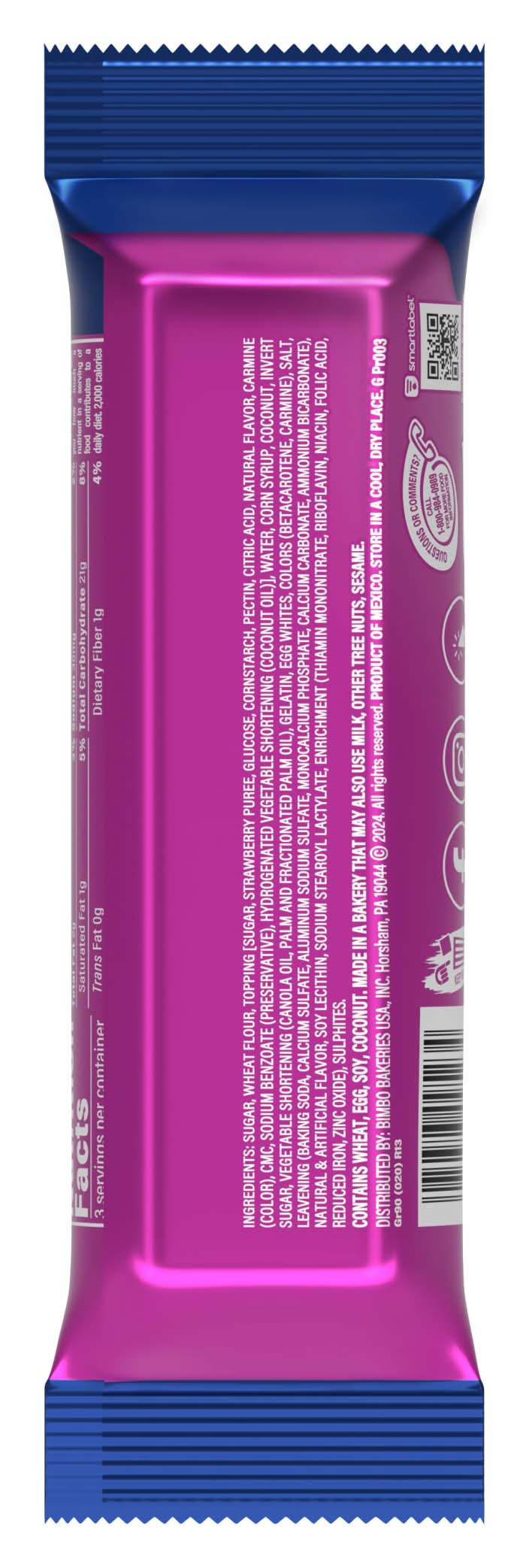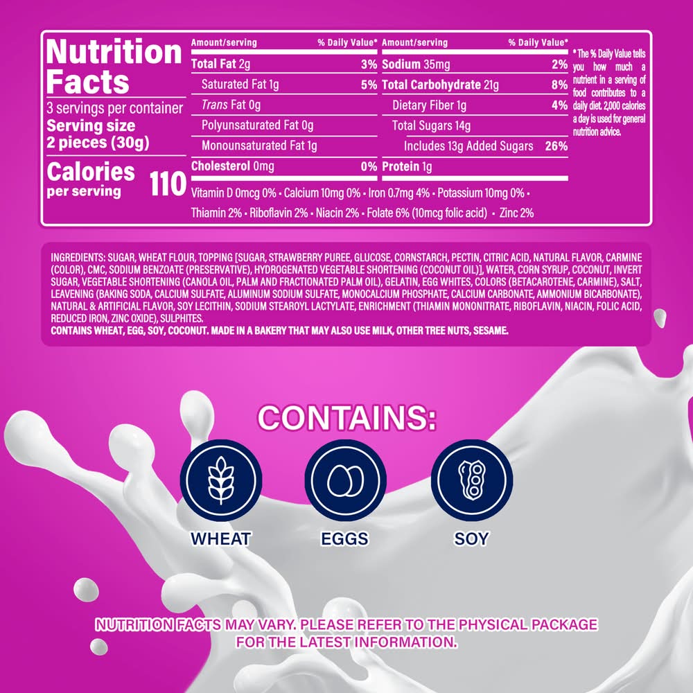 Ingredients: SUGAR, WHEAT FLOUR, TOPPING [SUGAR, STRAWBERRY PUREE, GLUCOSE, CORNSTARCH, PECTIN, CITRIC ACID, NATURAL FLAVOR, CARMINE (COLOR), CMC, SODIUM BENZOATE (PRESERVATIVES), HYDROGENATED VEGETABLE SHORTENING (COCONUT OIL)], WATER, CORN SYRUP, COCONUT, INVERT SUGAR, VEGETABLE SHORTENING [CANOLA OIL, PALM OIL, FRACTIONATED PALM OIL], GELATIN, EGG WHITES, COLORS [BETACAROTENE, CARMINE], SALT, LEAVENING [BAKING SODA, CALCIUM SULFATE, ALUMINUM SODIUM SULFATE, MONOCALCIUM PHOSPHATE, CALCIUM CARBONATE, AMMONIUM BICARBONATE], NATURAL AND ARTIFICIAL FLAVORS, SOY LECITHIN, SODIUM STEAROYL LACTYLATE, ENRICHMENT [THIAMIN MONONITRATE, RIBOFLAVIN, NIACIN, FOLIC ACID, REDUCED IRON, ZINC OXIDE], SULPHITES. Contains: CONTAINS COCONUT, EGG, SOY, WHEAT.