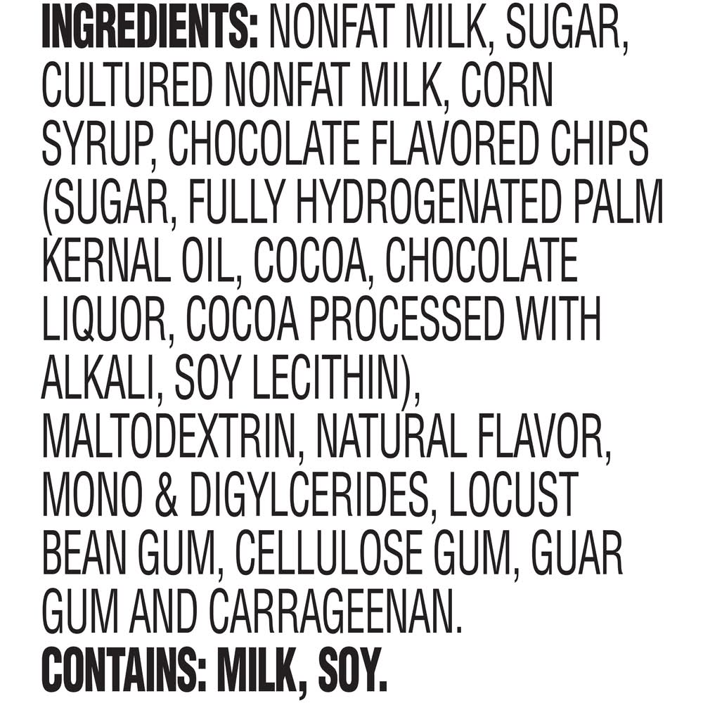 Nonfat Milk, Sugar, Cultured Nonfat Milk, Corn Syrup, Chocolate Flavored Chips (Sugar, Fully Hydrogenated Palm Kernel Oil, Cocoa, Chocolate Liquor, Cocoa Processed with Alkali, Soy Lecithin), Maltodextrin, Natural Flavor, Mono Diglycerides, Locust Bean Gum, Cellulose Gum, Guar Gum and Carrageenan. Contains: Contains milk and soy.