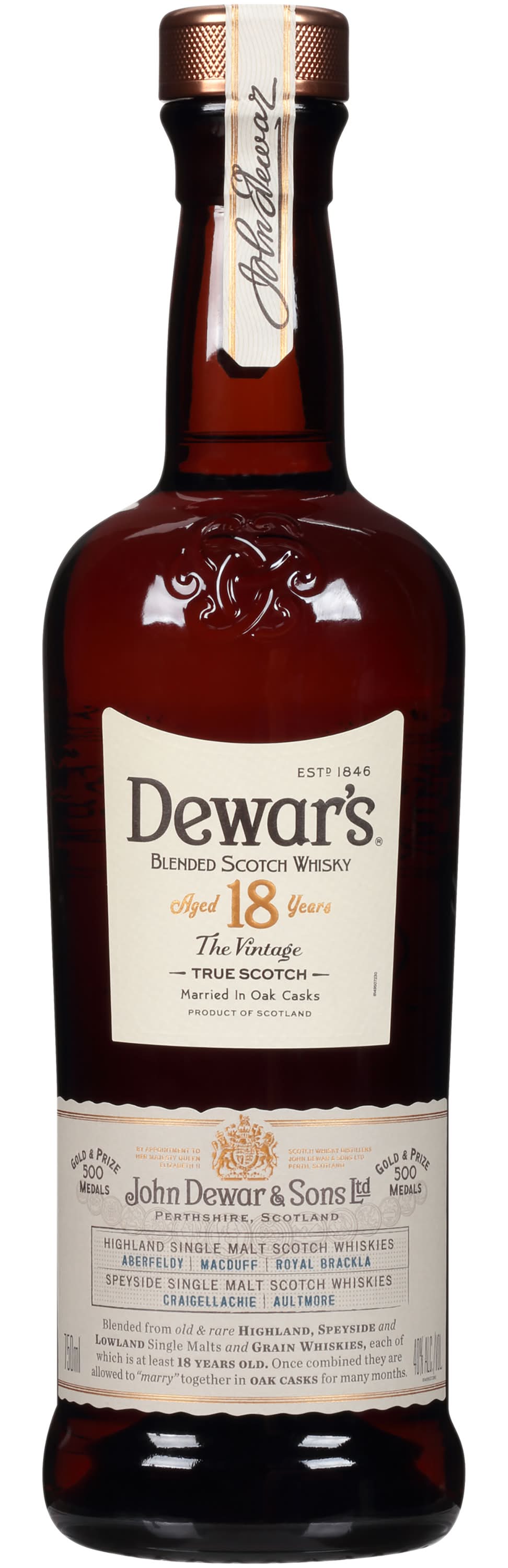 Dewar's 18 Year Old Blended Scotch Whisky is a blend of very rare vintage single malt and single grain Scotch whiskies, hence the nickname, “The Vintage.” Each bottle includes whiskies from the five single malt distilleries owned by John Dewar and Sons. The whiskies are then married in vintage oak casks. This special blend is creamy with notes of honey and marzipan. Alcohol by volume: 40%