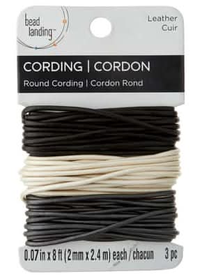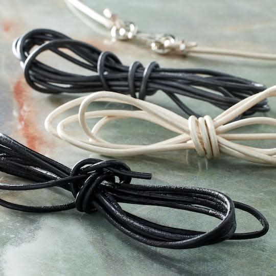 Purchase the Round Leather Cord. Use this neutral leather cord with different kinds of beads, sequins or gems to create trendy, personalized jewelry pieces. • Color: Assorted • Size: 2mm x 8yd
