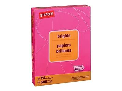 Bring bold color to fliers, memos and other documents with this Staples Brights fuchsia 24-pound colored paper. Create unique documents with this fuchsia paper. The 24-pound paper weight prevents bleed-through to keep printouts looking crisp, while the letter-size sheets fit neatly in standard printer and copier paper trays. Acid-free, archive-safe construction resists fading and deteriorating over time. With 500 sheets per ream, this Staples Brights colored paper offers an ample supply for presentations, mailers and other printouts. - Reliable multipurpose paper is perfect for everyday use - Paper measuring: 8.5 x 11 (US letter) - Paper weight: 24 lbs. - Bright colored paper is ideal for direct mail, flyers, and office or school projects - Purple color for an attractive look - Contains 500 sheets per ream - Meets or exceeds FSC standard - Acid-free to keep paper from crumbling or yellowing Attention Getting Color No one misses announcements printed on this paper. The bright fuchsia shade is visually arresting, so it's the perfect color to use for creating important safety updates, sign-up sheets and customer advertisements. The color is also cheerful and appealing to brighten up a drab office environment or any work space where children visit. Durable and Lasting This acid-free paper doesn't deteriorate quickly. Use it to make signs that have to stay posted indefinitely without worry of the need to replace them often. You need only a single thumbtack or piece of tape to hang this lightweight paper on a wall. Multipurpose Use this paper in a multitude of ways. It's compatible with all office printers. Slip sheets of fuchsia paper into stacks of white paperwork to serve as visual markers; use it as scratch paper; include it in decorative bulletin boards or give it to employees' visiting children to use in art projects.