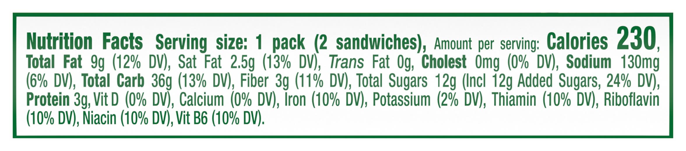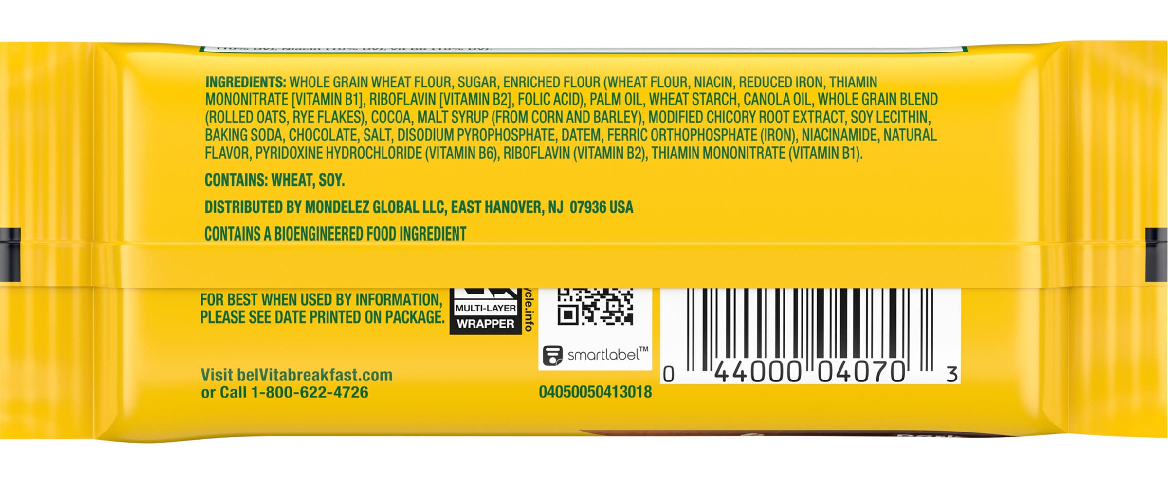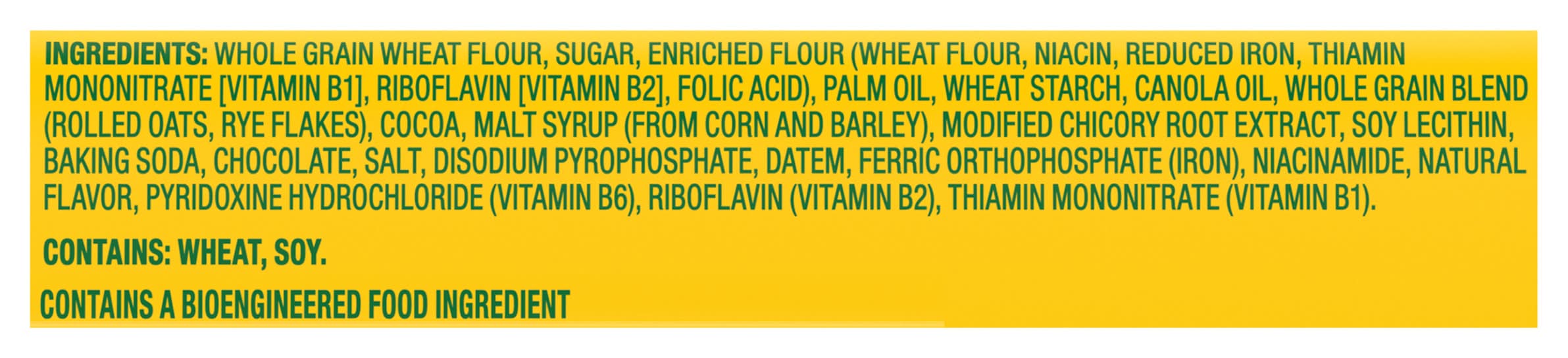 Ingredients: INGREDIENTS: WHOLE GRAIN WHEAT FLOUR, SUGAR, ENRICHED FLOUR (WHEAT FLOUR, NIACIN, REDUCED IRON, THIAMIN MONONITRATE [VITAMIN B1], RIBOFLAVIN [VITAMIN B2], FOLIC ACID), PALM OIL, CORNSTARCH, CANOLA OIL, WHOLE GRAIN BLEND (ROLLED OATS, RYE FLAKES), COCOA, MALT SYRUP (FROM CORN AND BARLEY), MODIFIED CHICORY ROOT EXTRACT, SOY LECITHIN, BAKING SODA, CHOCOLATE, SALT, DISODIUM PYROPHOSPHATE, DATEM, FERRIC ORTHOPHOSPHATE (IRON), NIACINAMIDE, NATURAL FLAVOR, PYRIDOXINE HYDROCHLORIDE (VITAMIN B6), RIBOFLAVIN (VITAMIN B2), THIAMIN MONONITRATE (VITAMIN B1), . CONTAINS: WHEAT, SOY. Contains: CONTAINS: WHEAT, SOY.