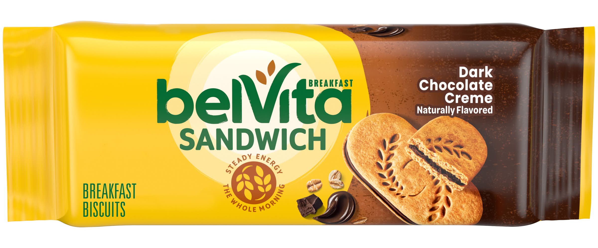 Start your morning off right with delicious belVita Breakfast Sandwich Dark Chocolate Creme Breakfast Biscuits. Featuring luscious dark chocolate flavored creme between two breakfast biscuits, these breakfast cookies make a delicious instant breakfast food. Specially baked, these BelVita breakfast sandwiches contain slow-release carbs that break down gradually in the body to deliver delicious, steady energy all morning long so you can enjoy these with your morning coffee, yogurt and fruit or as an instant breakfast food no matter what the morning brings. Each 50 gram serving contains 15 grams of whole grain and 3 grams of fiber for a delicious alternative to snack bars. A simple addition to your morning, these cholesterol-free biscuits for breakfast contain no high-fructose corn syrup and no artificial colors, flavors or sweeteners. What are you waiting for? These convenient chocolate biscuits made with wholesome grains are a great alternative to traditional breakfast snacks. These breakfast biscuits are also energizing alternatives to snack bars and wholesome additions to college care packages. Each individual pack contains 2 belVita Breakfast Sandwich Cookies for you to enjoy on the go, at the office or at home for lasting morning energy. Flavor: Dark chocolate creme