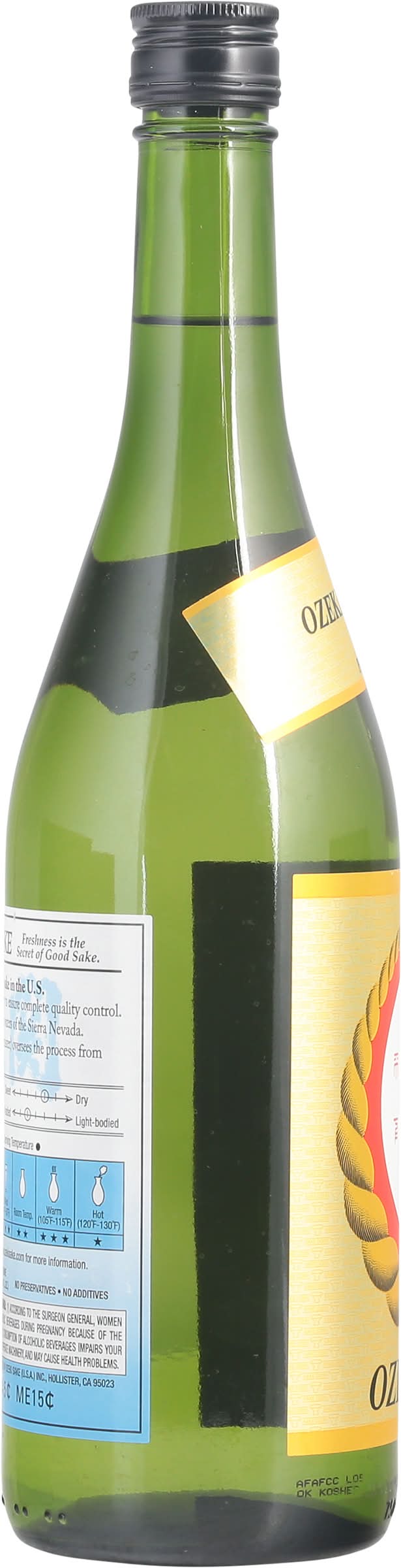 No preservatives. Since 1711. Freshness is the secret of good sake. The finest sake in the U.S. We will the rice at our facility to ensure complete quality control. We combine it with the pure waters of the Sierra Nevada. Our certified Toji (sake brew master) oversees the process from start to finish. This well-balanced traditional sake is full-bodied with a light melon flavor. Type: Junmai. Sake meter value: +4. Acidity: 1.6. Sweet dry. Full-bodied light bodied. No additives. www.ozekisake.com. Visit us at www.ozekisake.com for more information. 14.5% 29 Produced and bottled by Ozeki Sake (U.S.A) Inc, Hollister, CA 95023. • Alcohol by volume: 14.5% • Ozeki Sake (U.S.A.) Inc.,