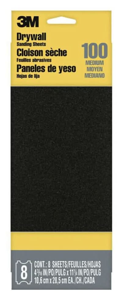 3M Drywall Sanding Sheets are designed for sanding drywall joint compounds (light or regular), patching compounds, and plaster. It is made with aluminum oxide, a tough synthetic mineral that cuts cleanly and leaves a smooth finish. Pre-cut sheets shearing-cut to fit most drywall sanding tools. Made with sharp synthetic mineral for long lasting performance. • Color: Black • Size: Medium