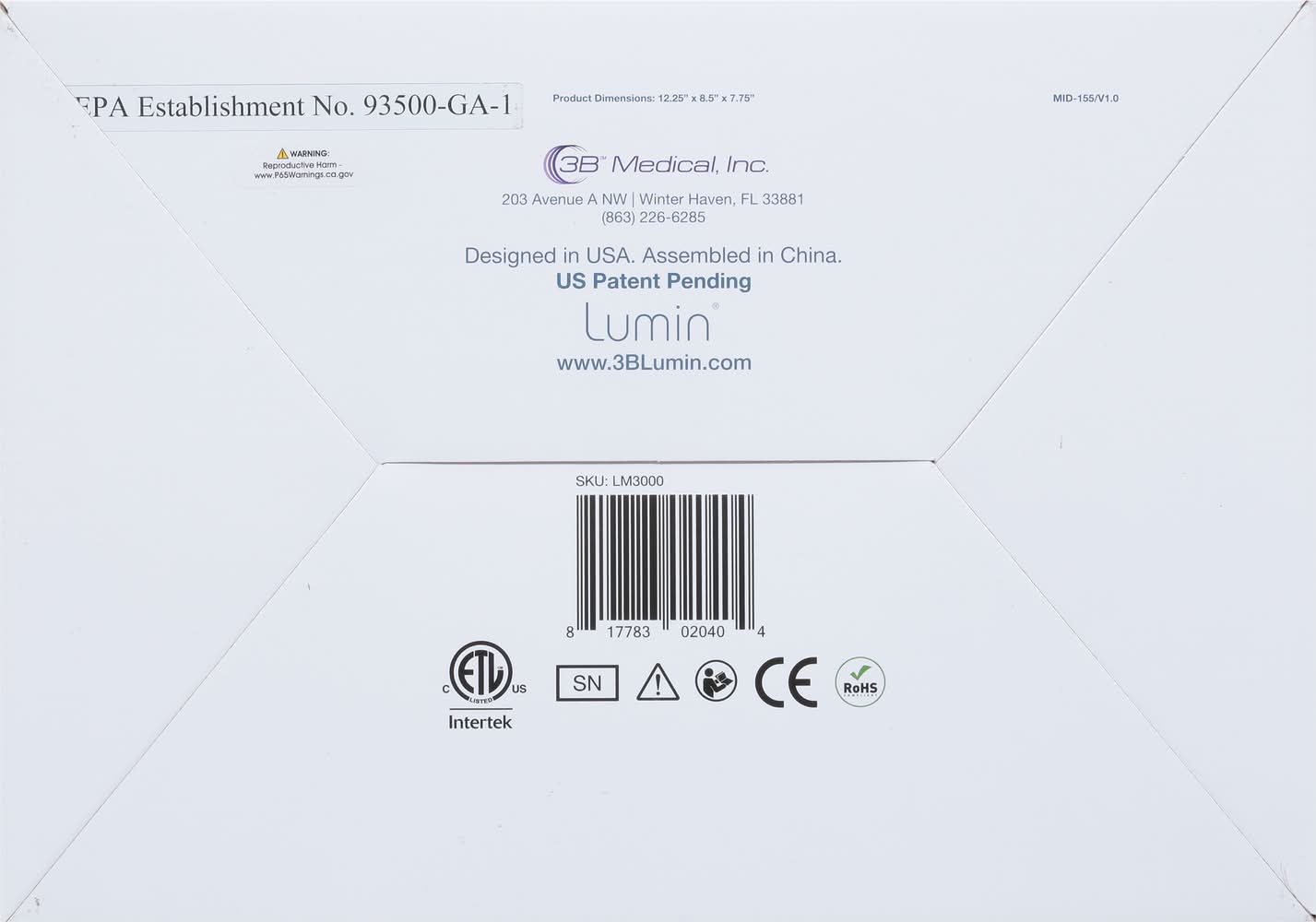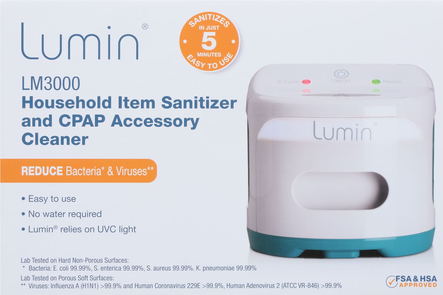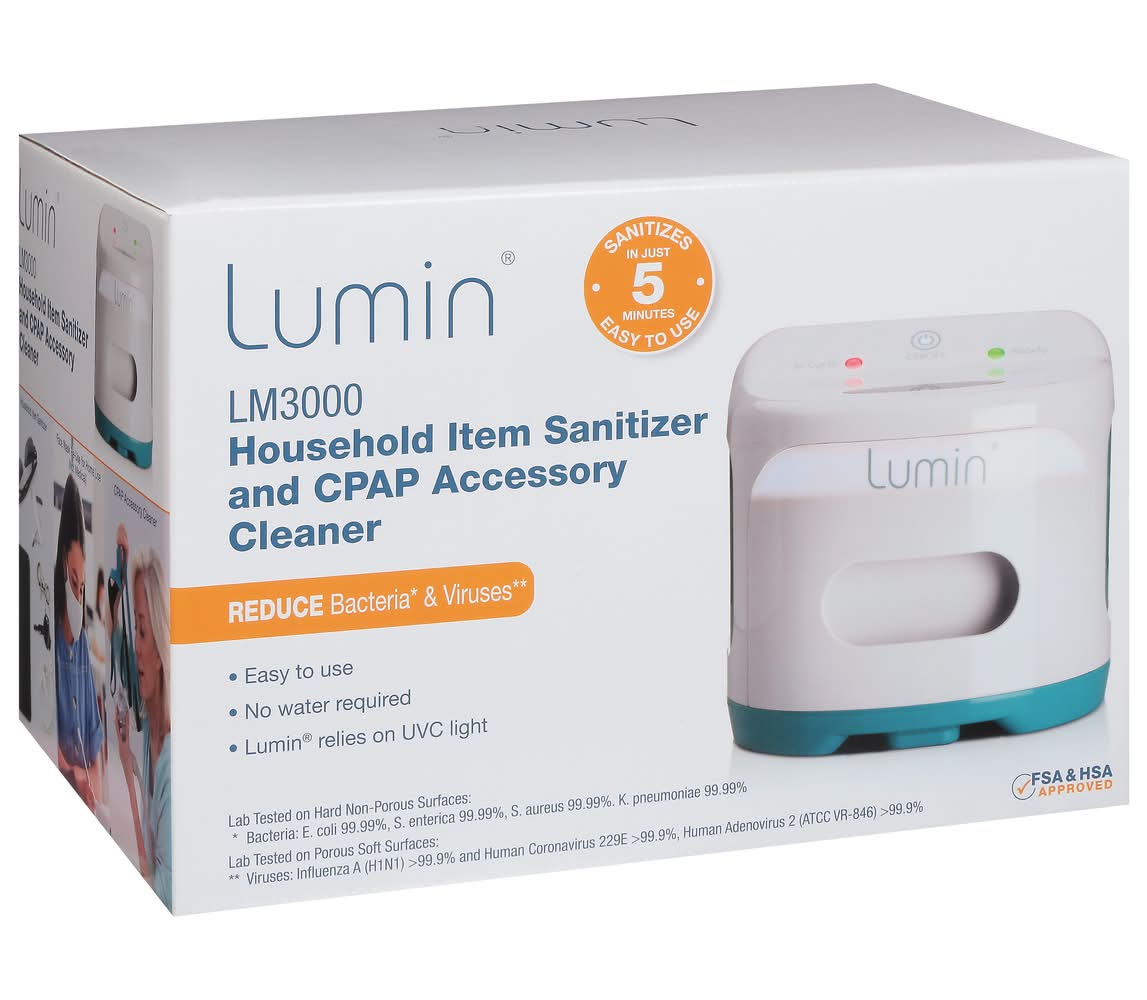 Reduce bacteria (Bacteria: E. coli 99.99%, S. enterica 99.99%, S. aureus 99.99%. K. pneumoniae 99.99%) & viruses (Viruses: Influenza A (H1N1) >99.9% and Human Coronavirus 229E >99.9%, Human Adenovirus 2 (ATCC VR-846) >99.9%). Easy to use. No water required. Lumin relies on UVC light. Lab Tested on Hard Non-Porous Surfaces: Bacteria: E. coli 99.99%, S. enterica 99.99%, S. aureus 99.99%. K. pneumoniae 99.99%. Lab Tested on Porous Soft Surfaces: Viruses: Influenza A (H1N1) >99.9% and Human Coronavirus 229E >99.9%, Human Adenovirus 2 (ATCC VR-846) >99.9%. Sanitizes in just 5 minutes east to use. Household item sanitizer. Face mask re-use for home use (not medical). CPAP accessory cleaner. Lumin UVC bulb, rack and cleaning wipes samples included. Cleans your CPAP accessories. CE listed. FSA & HSA Approved. RoHS Compliant. www.3blumin.com. Designed in USA. Assembled in China. 3B Medical, Inc.,