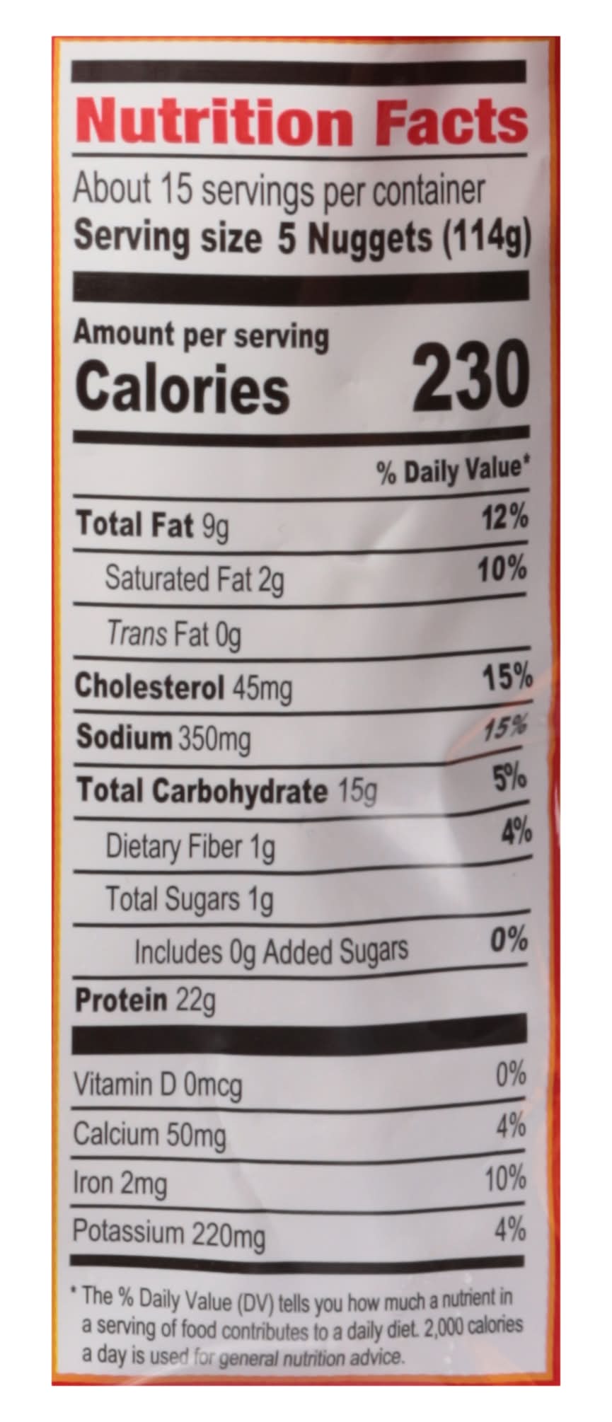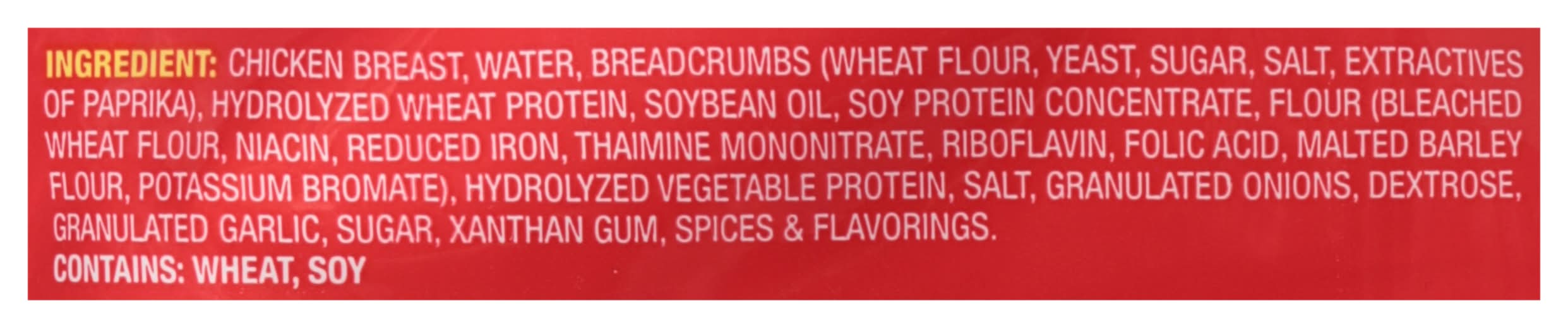 Chicken Breast, Water, Breadcrumbs (Wheat Flour, Yeast, Sugar, Salt, Extractives of Paprika), Hydrolyzed Wheat Protein, Soybean Oil, Soy Protein Concentrate, Flour (Bleached Wheat Flour, Niacin, Reduced Iron, Thiamine Mononitrate, Riboflavin, Folic Acid, Malted Barley Flour, Potassium Bromate), Hydrolyzed Vegetable Protein, Salt, Granulated Onions, Dextrose, Granulated Garlic, Sugar, Xanthan Gum, Spices & Flavorings Contains: Wheat, soy