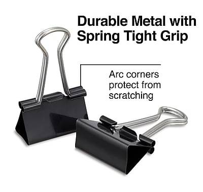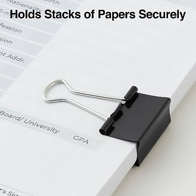 Bind large stacks of documents securely together with this 144-pack of Staples medium 5/8-inch-capacity black metal binder clips. Keep documents and other paperwork organized and tidy with these black metal binder clips. Each clip is built with sturdy metal and plastic, while the spring design provides a strong grip on papers. These Staples medium binder clips come in a massive pack of 144 units, making them ideal for those with lots of documents to manage. - A simple way to keep loose documents together in one spot - Width: 1.26 - 0.63 capacity ensures related documents stay together - Black and made of steel - 144 per pack Keep stacks of paper together without using binders or folders by snapping one of these Staples metal binder clips onto each stack. You can also use these versatile clips to close file folders for easy carrying. The clips are easy to use and extremely secure. Ease of Use All you need to do is spread each of these Staples metal binder clips open with the provided handles, and then insert your papers before you let go of the clip. The clip's secure jaws will close down over the papers and hold them together. Strong Holding Power These clips clamp down strongly and securely around your papers. They prevent individual pages from falling out or slipping out of a stack. Convenient and Versatile You can use these clips to secure file folders for carrying or clip a paper to an easel, a desktop, or another hard, flat, open-edged surface. These Staples metal binder clips are medium sized.