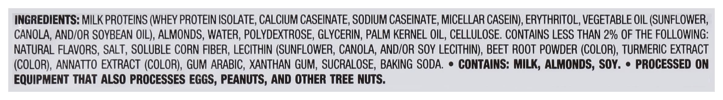 Ingredients: Milk Proteins (Whey Protein Isolate, Calcium Caseinate, Sodium Caseinate, Micellar Casein), Erythritol, Vegetable Oil (Sunflower, Canola, and/or Soybean Oil), Almonds, Water, Polydextrose, Glycerin, Palm Kernel Oil, Cellulose, Contains Less than 2% of the Following: Natural Flavors, Salt, Soluble Corn Fiber, Lecithin (Sunflower, Canola, and/or Soy Lecithin), Beet Root Powder (Color), Turmeric Extract (Color), Annatto Extract (Color), Gum Arabic, Xanthan Gum, Sucralose, Baking Soda Contains: Milk, Tree Nuts, Almonds, Soybeans, Eggs, Peanuts, Tree Nuts