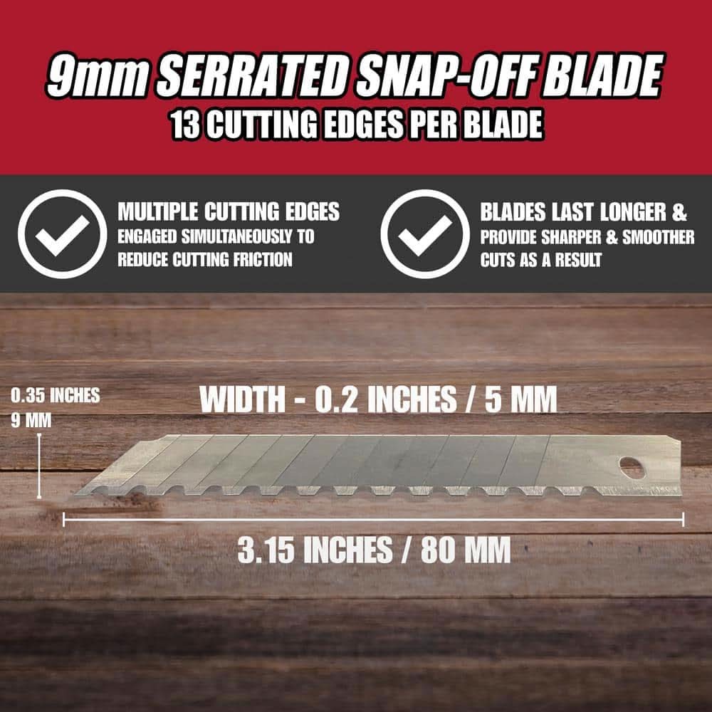 Husky serrated 9 mm snap blades last longer than single edge blades by engaging multiple cutting edges simultaneously, extending the cutting life of the blade. Less blade changes saves you time. The precision honed blades fit most standard snap knives. 9 mm serrated Snap-Off Blades provide 13 new blade edges to keep you going, reducing frequent blade changes. The Serrated Blades offer 2X's the blade life and are 2X's Sharper than other standard blades. Size: 9 mm
