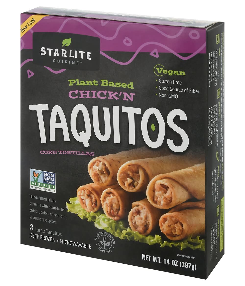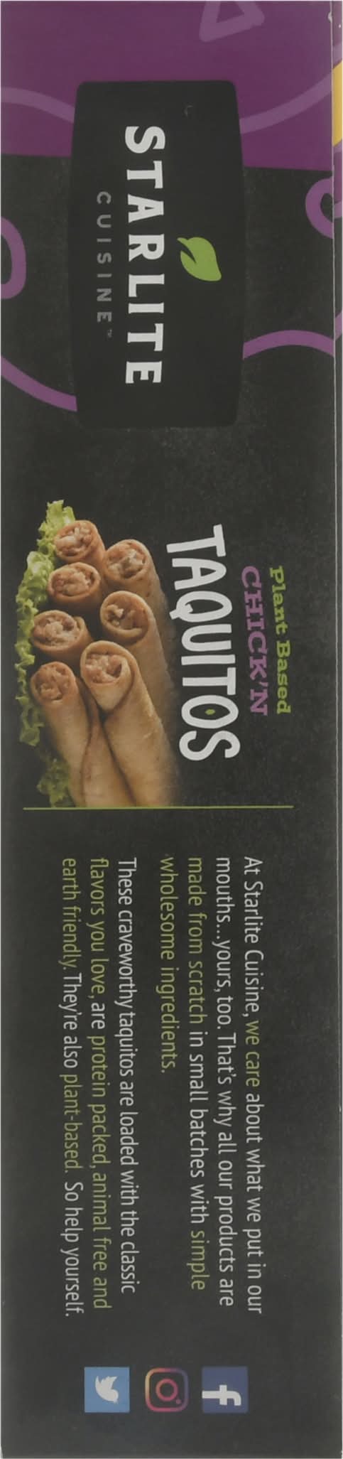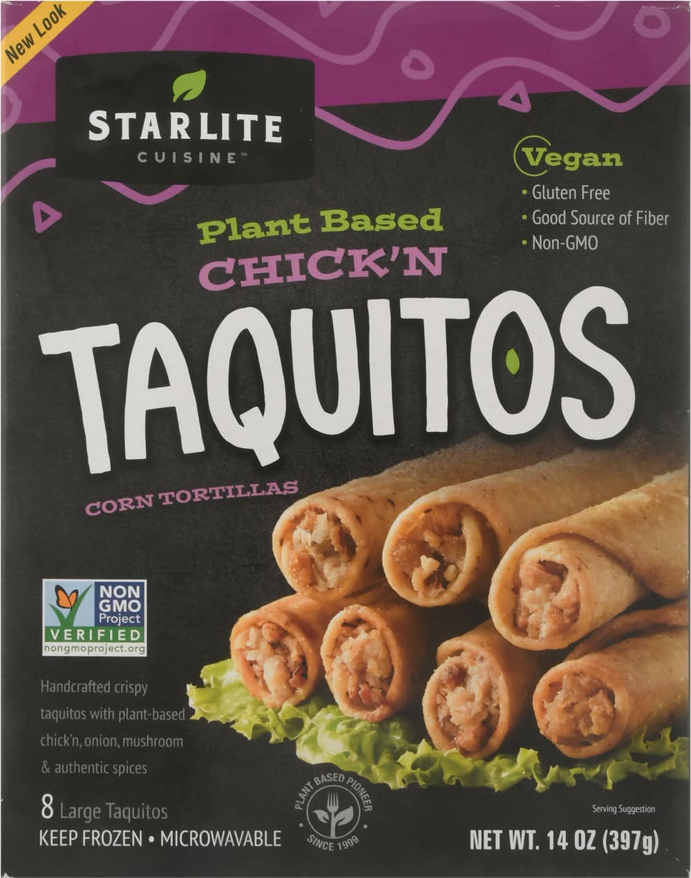 Corn tortillas. Vegan. Gluten free. Non-GMO. Non GMO Project verified. nongmoprojectverified.org. New look. Handcrafted crispy taquitos with plant-based chick'n, onion, mushroom & authentic spices. Microwavable. Plant based pioneer. Since 1999. At Starlite Cuisine, we care about what we put in our mouths - yours, too. That's why all our products are made from scratch in small batches with simple wholesome ingredients. These craveworthy taquitos are loaded with the classic flavors you love, are protein packed, animal free and earth friendly. They're also plant-based. So help yourself. Plant based. starlitecuisine.com. Facebook. Instagram. Twitter. For great guacamole, salsa & other tasty recipes, please visit starlitecuisine.com. Made from 100% recycled paper. Product of USA. • Starlite Cuisine, • Packaging: Reusable