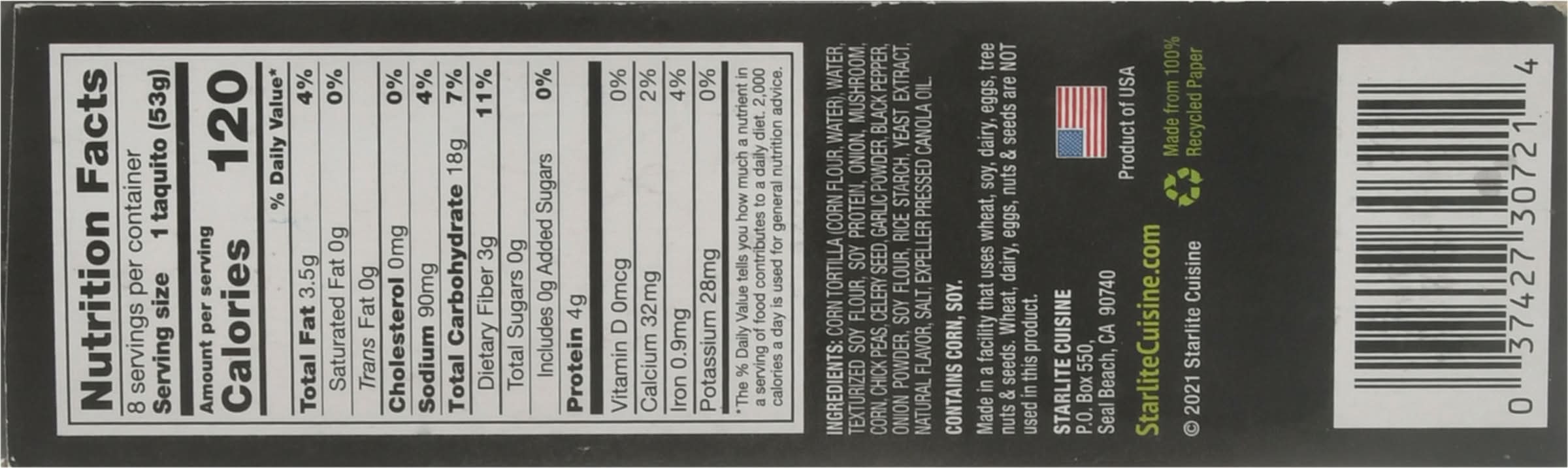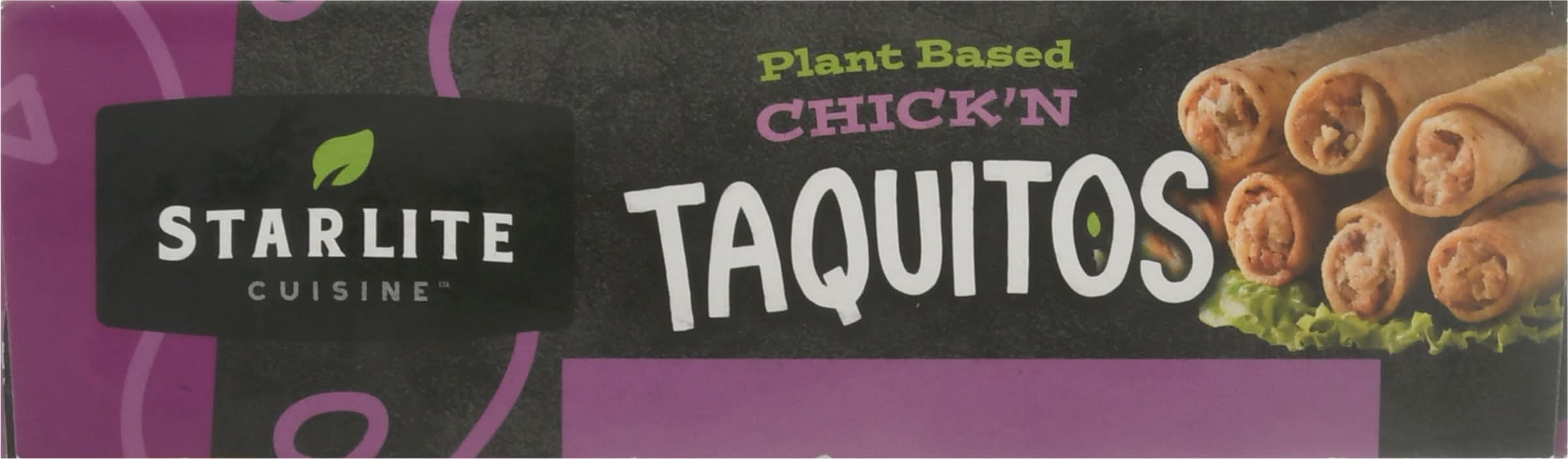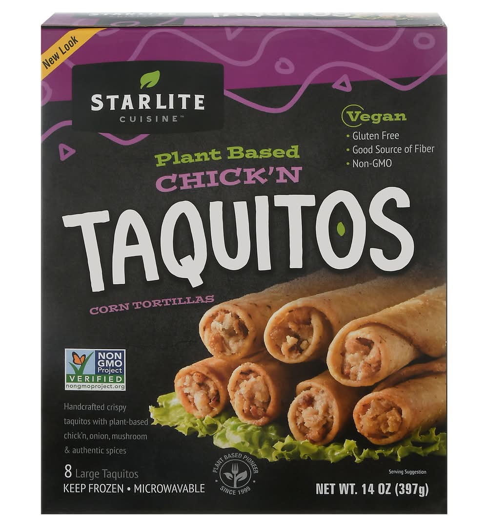 Corn tortillas. Vegan. Gluten free. Non-GMO. Non GMO Project verified. nongmoprojectverified.org. New look. Handcrafted crispy taquitos with plant-based chick'n, onion, mushroom & authentic spices. Microwavable. Plant based pioneer. Since 1999. At Starlite Cuisine, we care about what we put in our mouths - yours, too. That's why all our products are made from scratch in small batches with simple wholesome ingredients. These craveworthy taquitos are loaded with the classic flavors you love, are protein packed, animal free and earth friendly. They're also plant-based. So help yourself. Plant based. starlitecuisine.com. Facebook. Instagram. Twitter. For great guacamole, salsa & other tasty recipes, please visit starlitecuisine.com. Made from 100% recycled paper. Product of USA. • Starlite Cuisine, • Packaging: Reusable