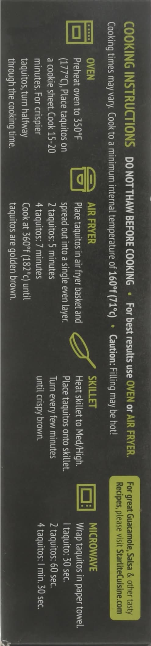 Directions for use: Microwave: Microwave: Wrap taquitos in paper towel. 1 taquito: 30 sec. 2 taquitos: 60 sec. 4 taquitos: 1 min. 30 sec. Skillet: Heat skillet to med/high. Place taquitos onto skillet. Turn every few minutes until crispy brown. Cooking Instructions: Do not thaw before cooking for best results use oven or air fryer. Cooking times may vary. Cook to a minimum internal temperature of 160 degrees F (71 degrees C). Caution: filling may be hot! Keep frozen. Storage recommendation: Keep frozen.