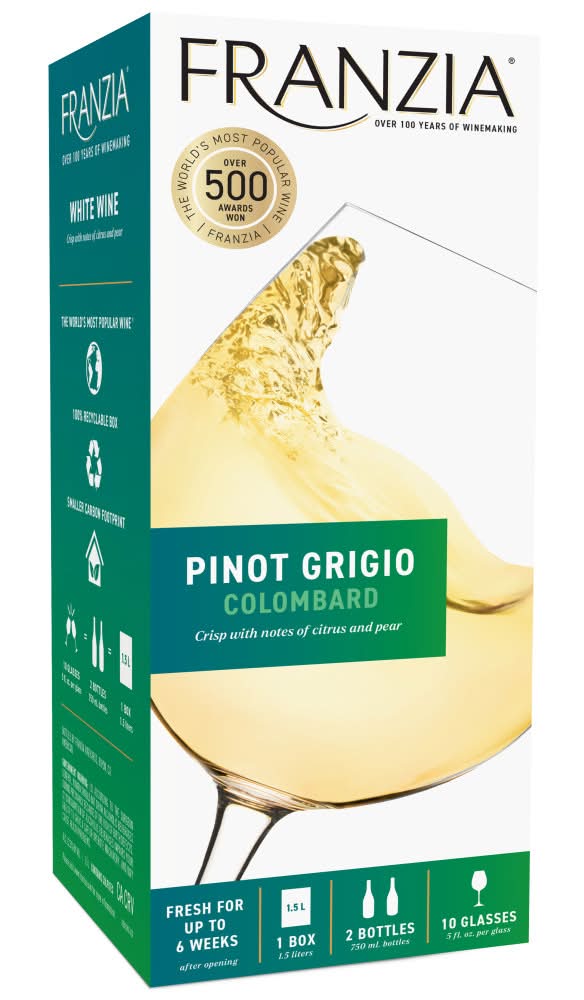 Enjoy Franzia Pinot Grigio Colombard white wine, a fresh, light-bodied wine featuring citrus and pear flavors with a vibrant and crisp finish. this wine pairs perfectly with garlic shrimp and crab salad. Serve it chilled to experience its full flavor, ideal for warm summer nights or gatherings with friends. Each 5L box is equivalent to six bottles of wine, providing thirty-four 5oz glasses. Franzia Pinot Grigio Colombard was honored with 91 points and a gold medal from the Monterey International Wine Competition in 2022 and can stay fresh up to six weeks after opening. • Alcohol by volume: 12.5% • Packaging: Reusable