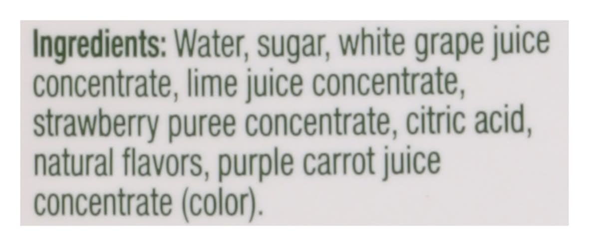 Water, Sugar, White Grape Juice Concentrate, Lime Juice Concentrate, Strawberry Puree Concentrate, Citric Acid, Natural Flavors, Purple Carrot Juice Concentrate (Color)