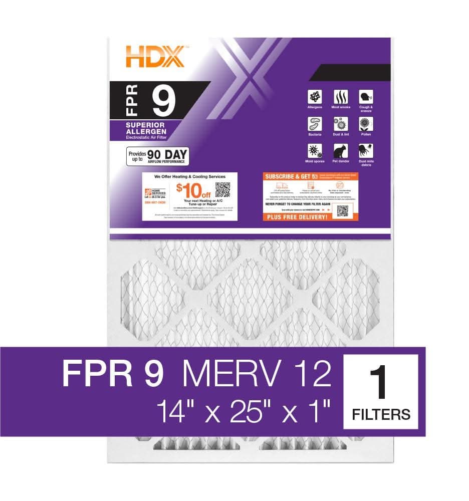 HDX Superior Pleated Air Filter Fpr 9 Merv 12, 14" X 25" X 1"