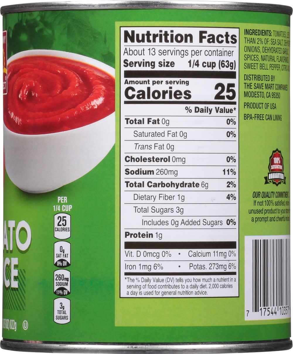 Per 1/4 Cup: 25 calories; 0 g sat fat (0% DV); 260 mg sodium (11% DV); 3 g total sugars. 100% satisfaction guaranteed. Our quality commitment - If not 100% satisfied, return unused product to your store for a prompt and cheerful refund. BPA-free can lining. Product of USA The Save Mart Companies,