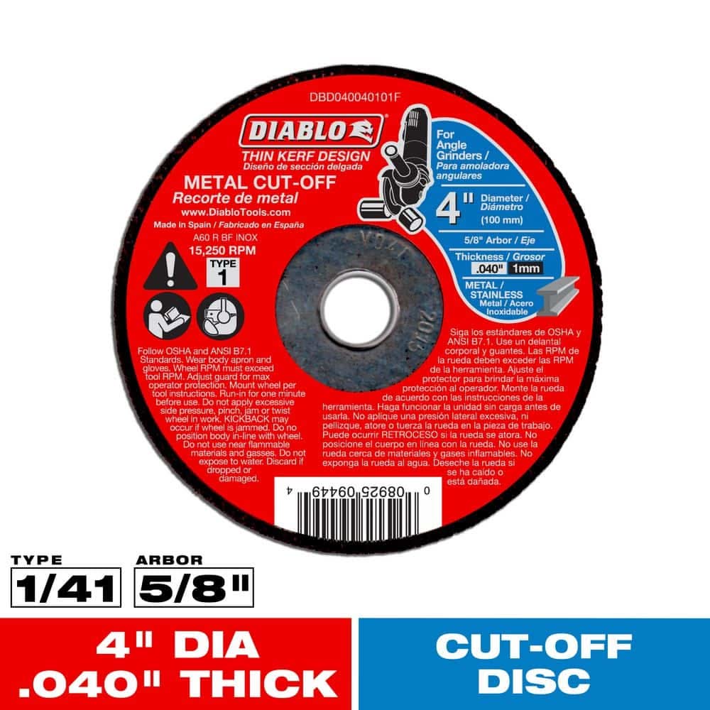 Diablo's premium 4 in. x 0.040 in. x 5/8 in. Metal Cut-Off Disc with Thin Kerf design provides premium performance and increases productivity. Diablo's Thin Kerf design provides for a thin cut, allowing your power tool to work at its full potential. Unlike other bonded discs on the market, this cut-off disc is a true 0.40 in. design. This disc is designed for use in angle grinders and is ideal for all types of metal/stainless steel materials. Size: 4x0.040x5/8 in
